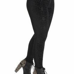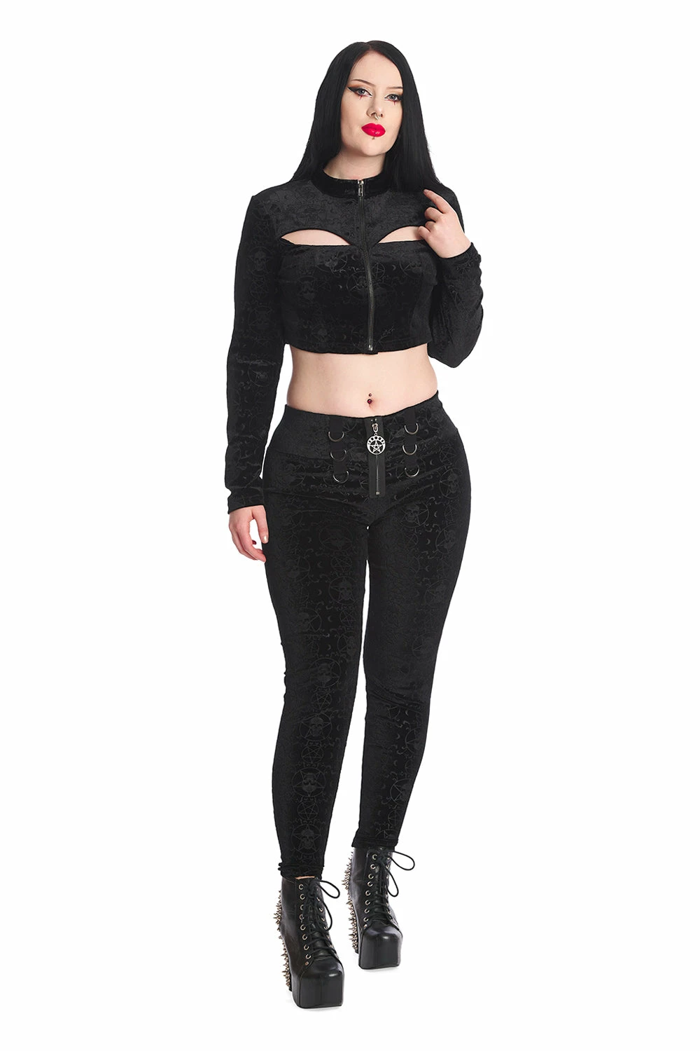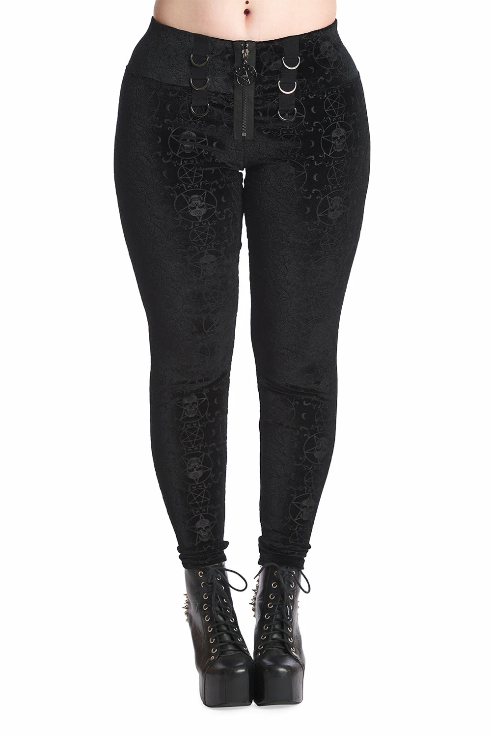 Gorgeous black leggings from Banned Apparel that are made from a soft stretch burnout velvet fabric that is fitted to show off your curves! These attention grabbing leggings feature a pentagram, moon and skull burnout pattern, zip up fly with metal pentagram pendant and metal D ring detailing. These stunning leggings are perfect for your look!