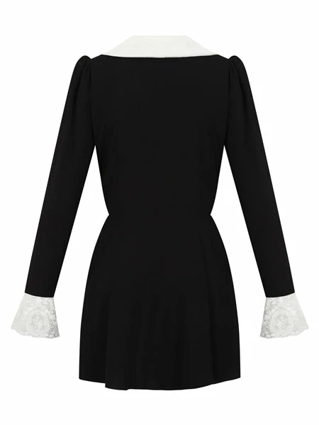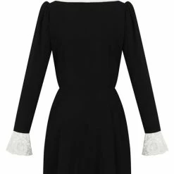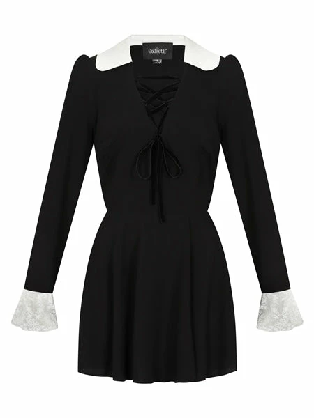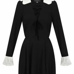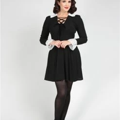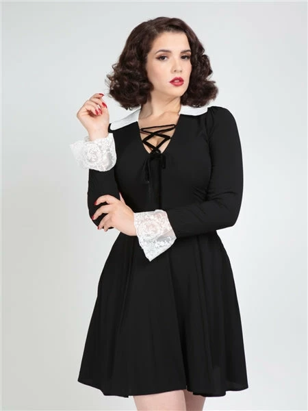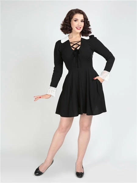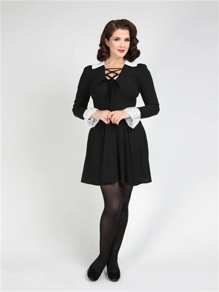Gorgeous black long sleeved skater dress from Collectif! With a flattering V-neckline and adjustable cross over spaghetti straps with contrast white collar and cuffs. The classic skater skirt falls mid thigh length and it fastens with a hidden side zip.