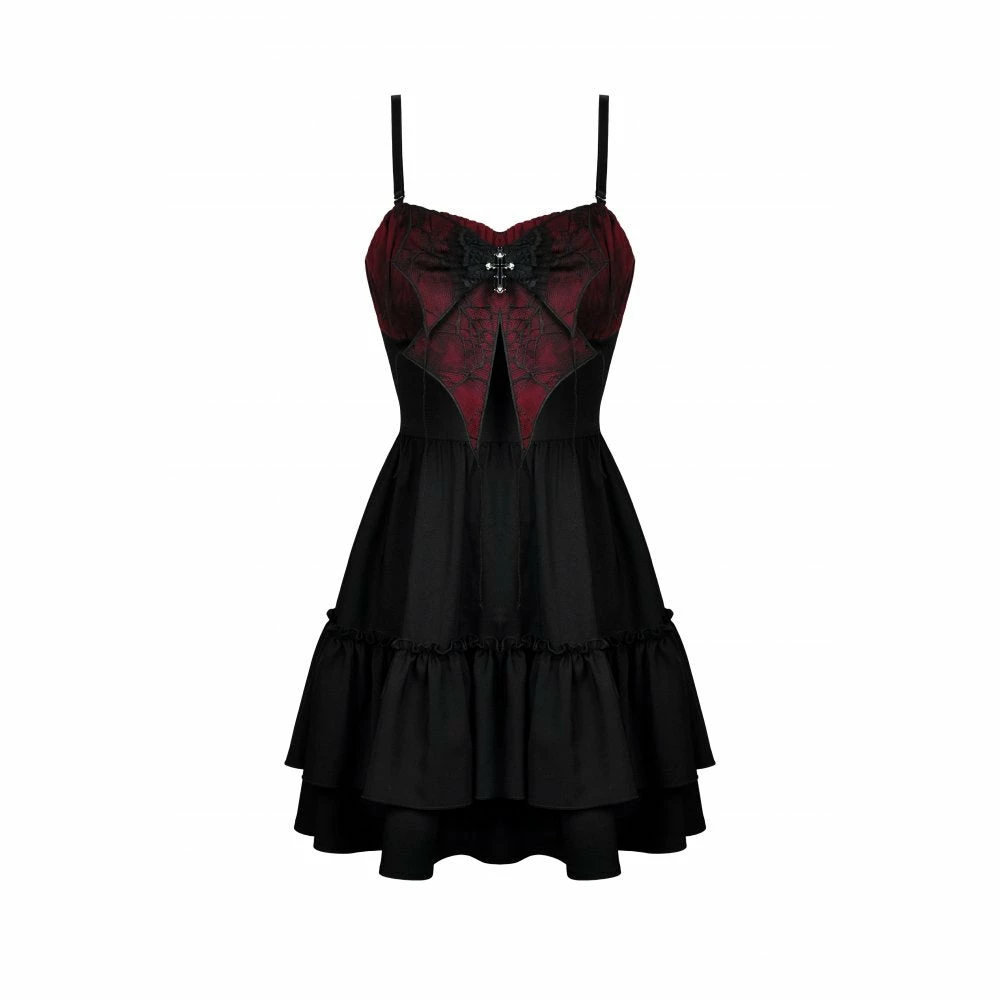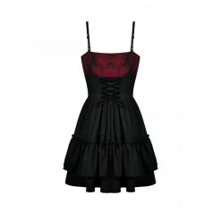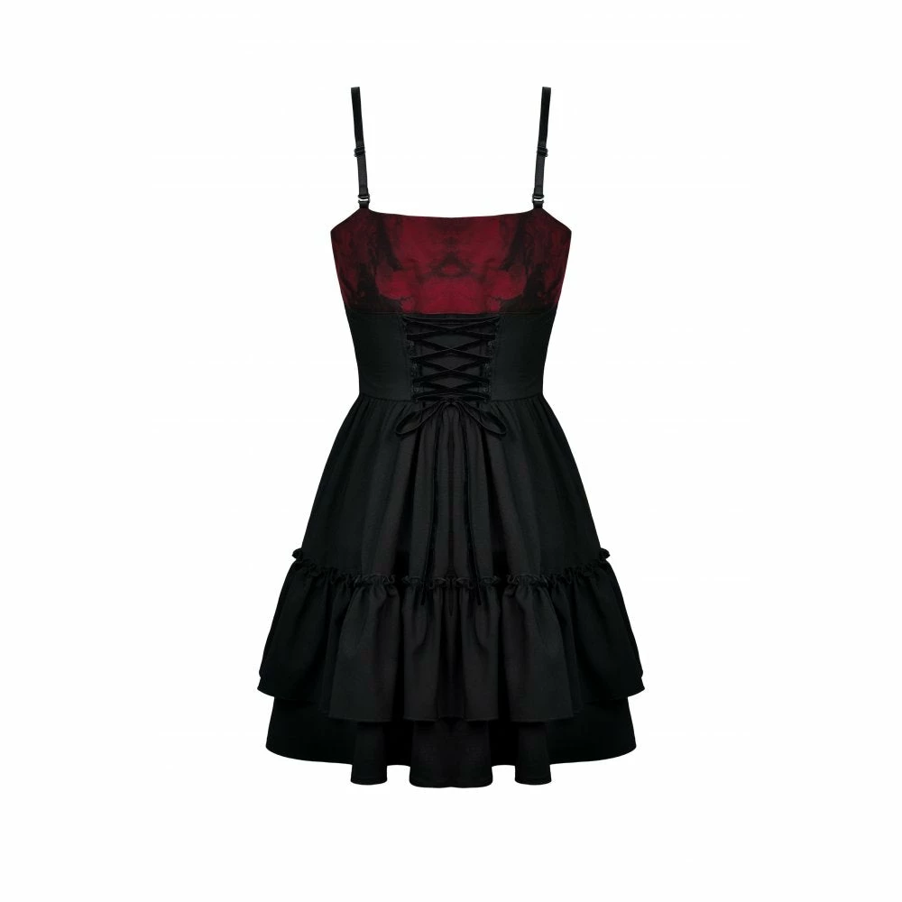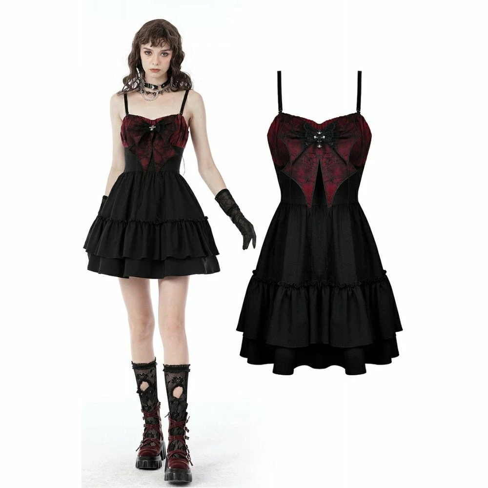 Lovely black sleeveless mini dress with large red and black bow on the front from Dark in Love. This elegant yet seductive party dress features a flowing skirt, gathered in waist, and corset lace up black to emphasize those curves!