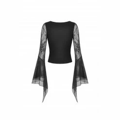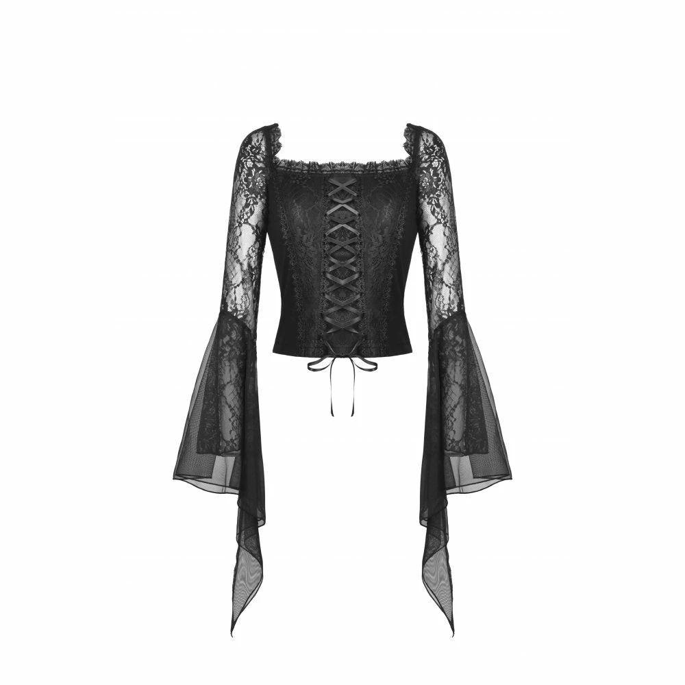 Dramatic and elegant gothic black top from Dark in Love made from a soft stretchy cotton fabric in a sexy body hugging fit! This beautiful top features exaggerated lace and mesh bell sleeves and a romantic corset style ribbon lace up front.