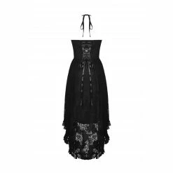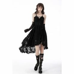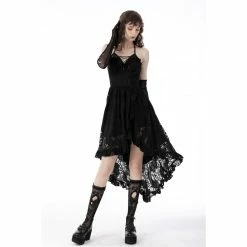 Elegant black sleeveless dress with seductive lace layering and high low hems from Dark in Love. This stunning gothic mid length dress features a flowing skirt layered, gathered in waist, and corset lace up back to maximize those curves!