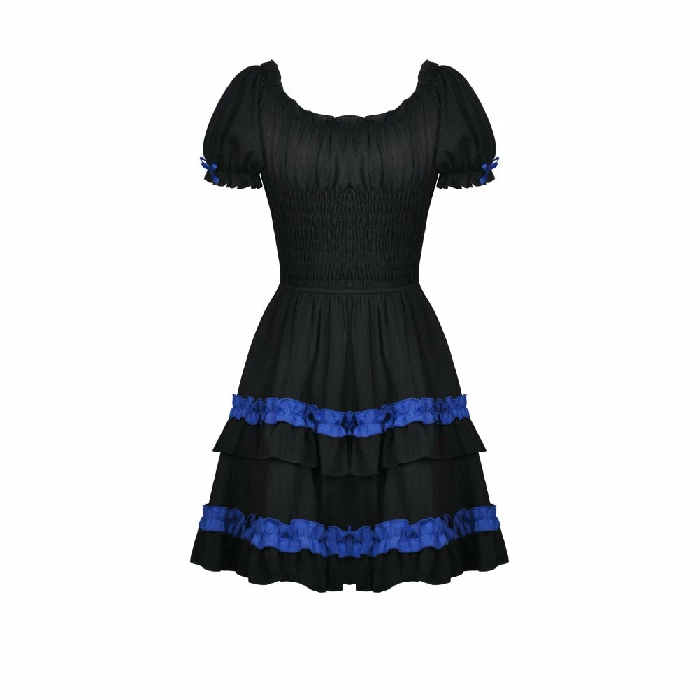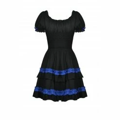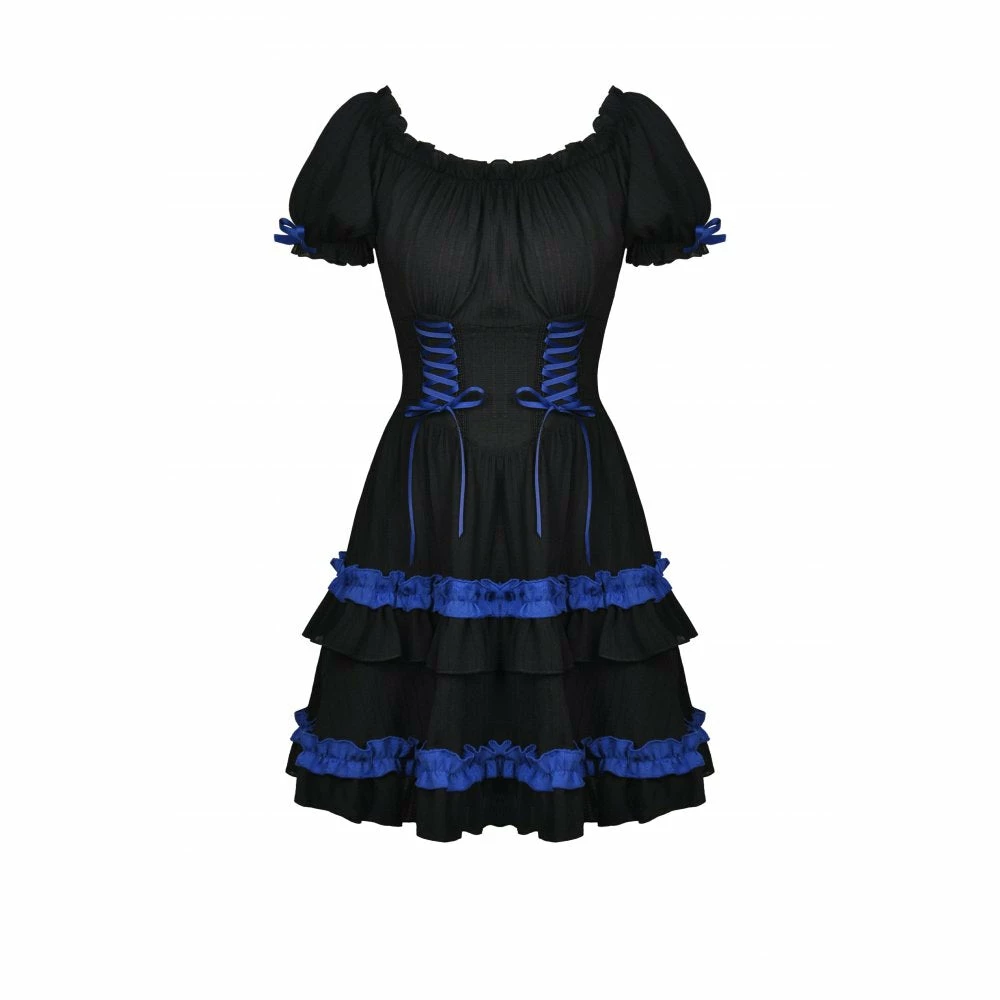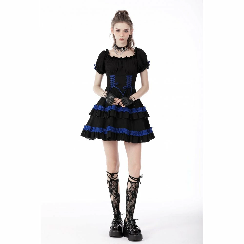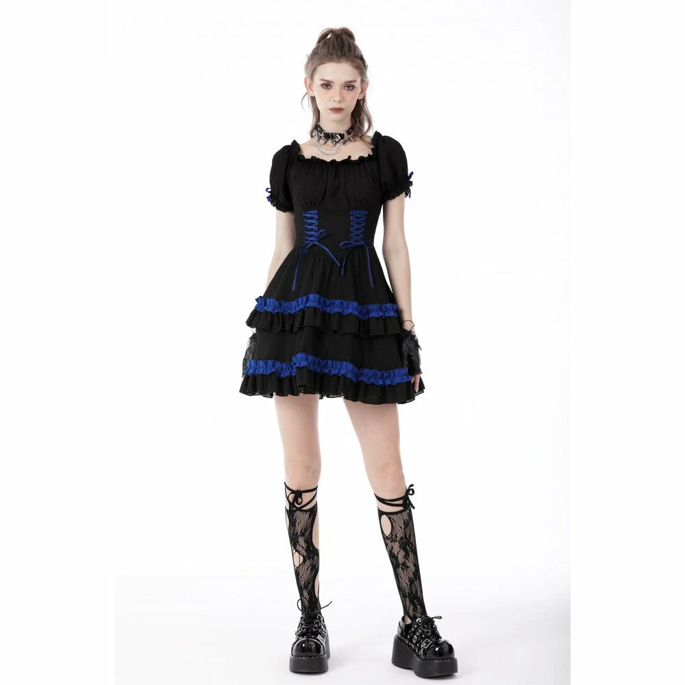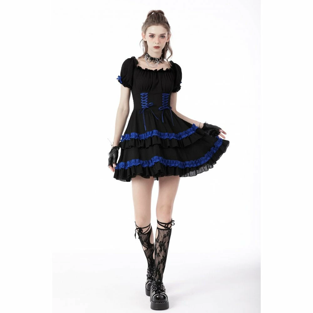 We love this black and blue short puff sleeve dress with ruffle layered skirt from Dark in Love. This gorgeous mini dress features an electric blue corset ribbon lace up front detailing, nipped in waist, and full skirt! Made from a soft stretch fabric and perfect for a night out.