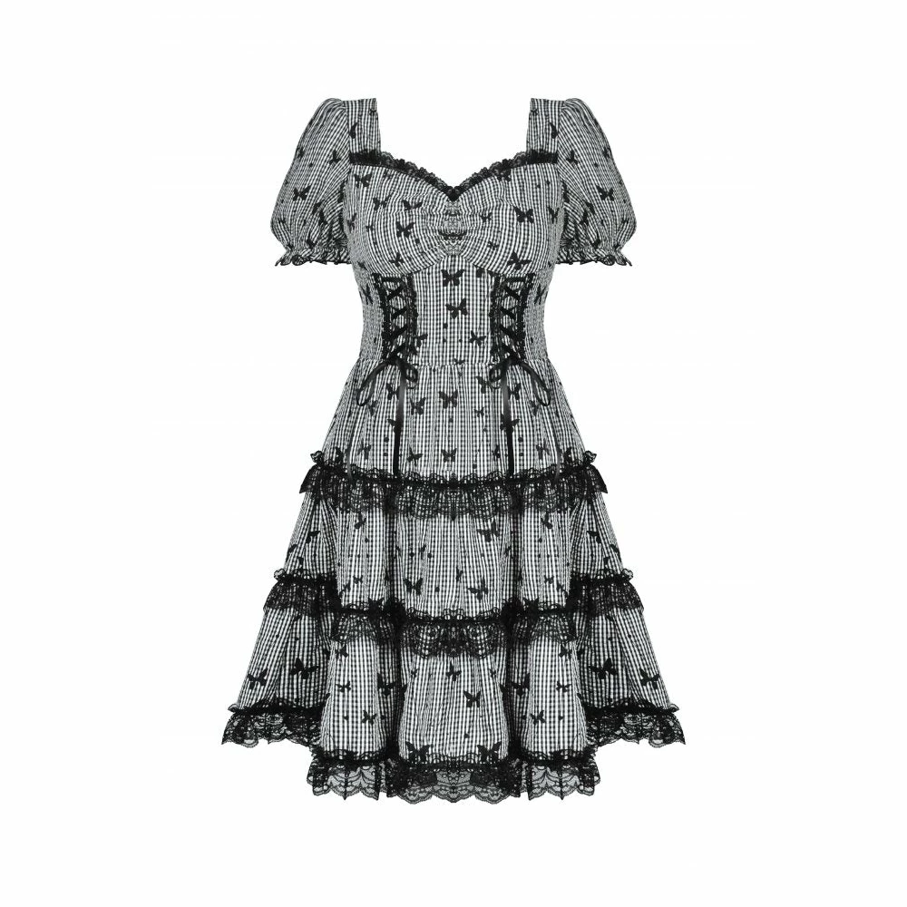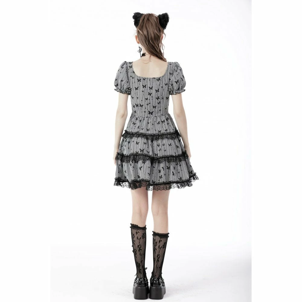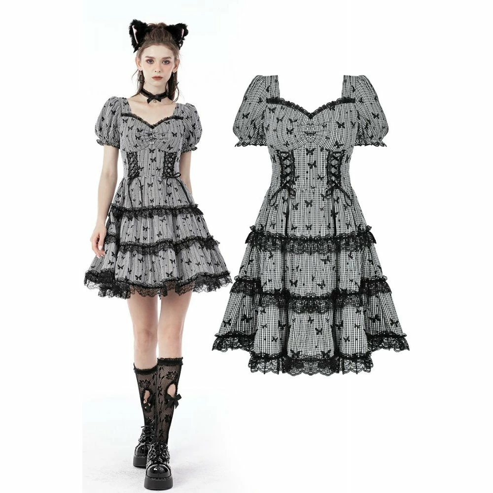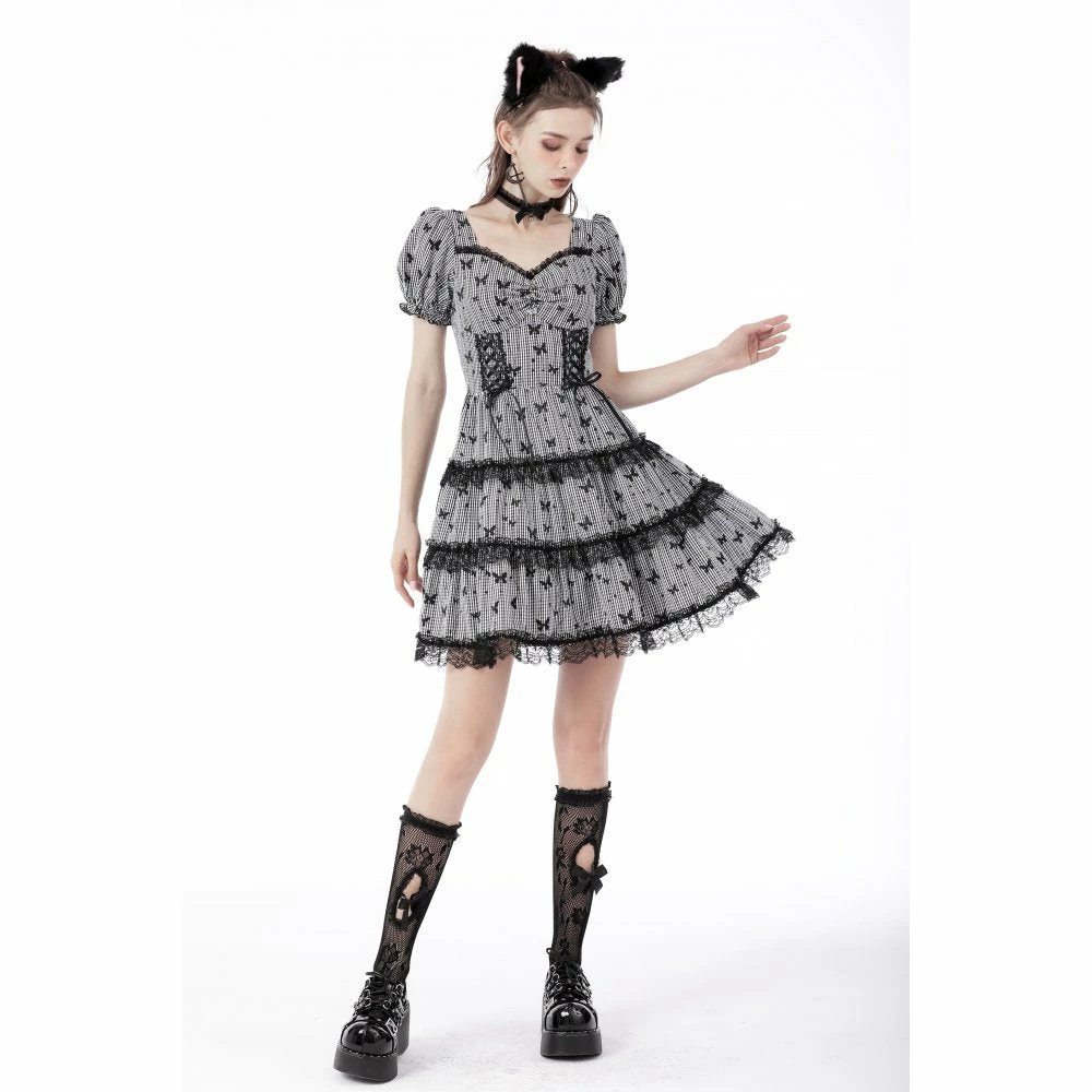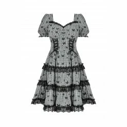 We love this black and gray short puff sleeve dress with ruffle layered skirt from Dark in Love. This gorgeous mini dress features an black corset ribbon lace up front detailing, nipped in waist, and full skirt! Made from a soft stretch fabric and perfect for a night out.