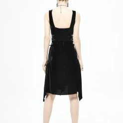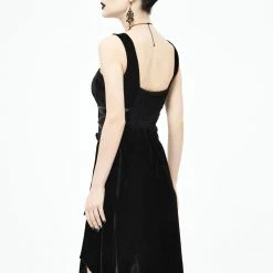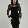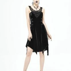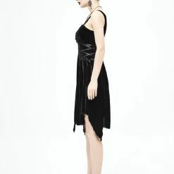 Stunning dress from Devil Fashion featuring an irregular hemline and corset-inspired ribbon lacing to the sides. With an elasticated panel to the back, this gorgeous dress has a striking lace applique neckline with bead details. For the perfect fit please see Devil Fashion’s size guide in the images.