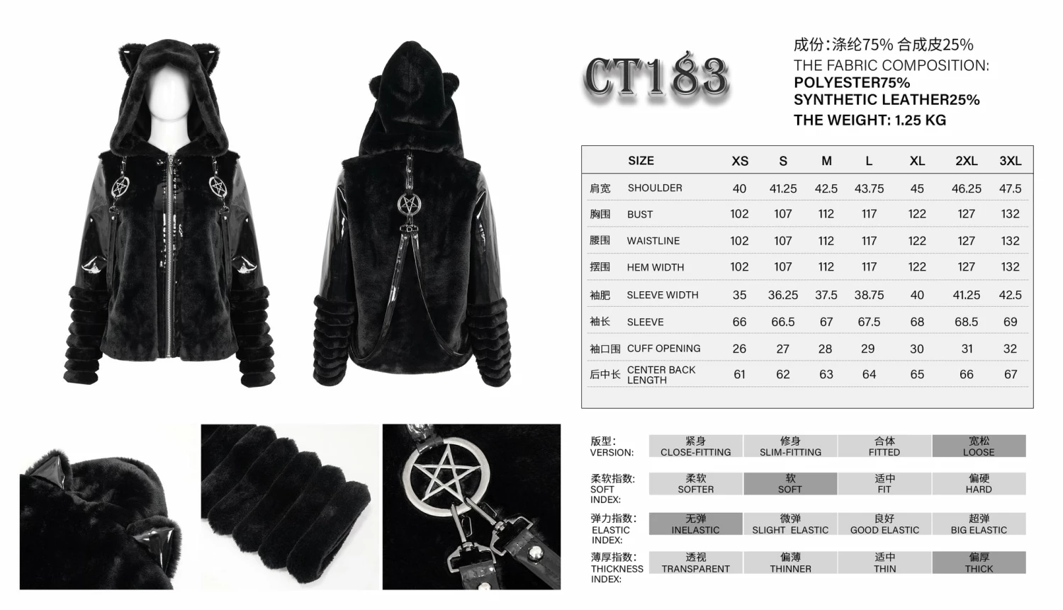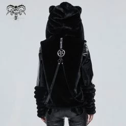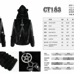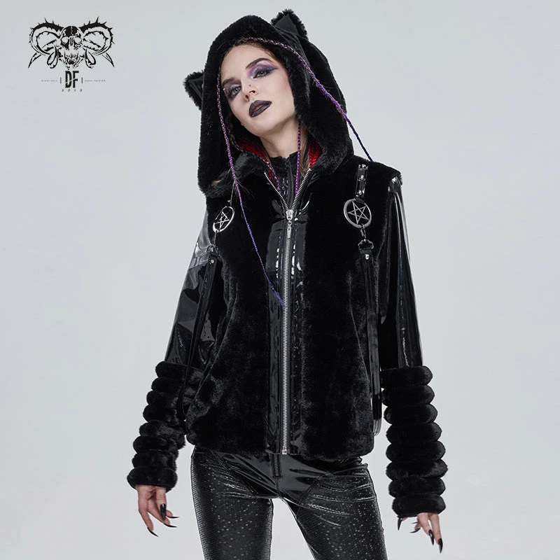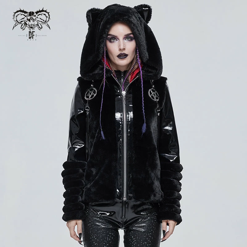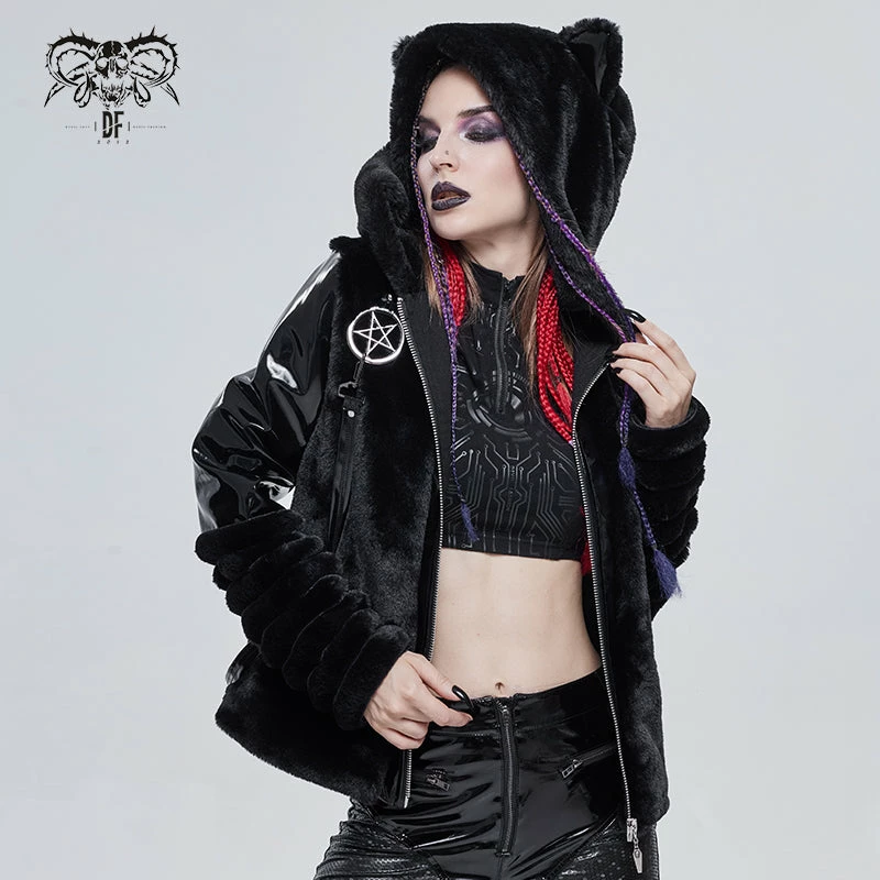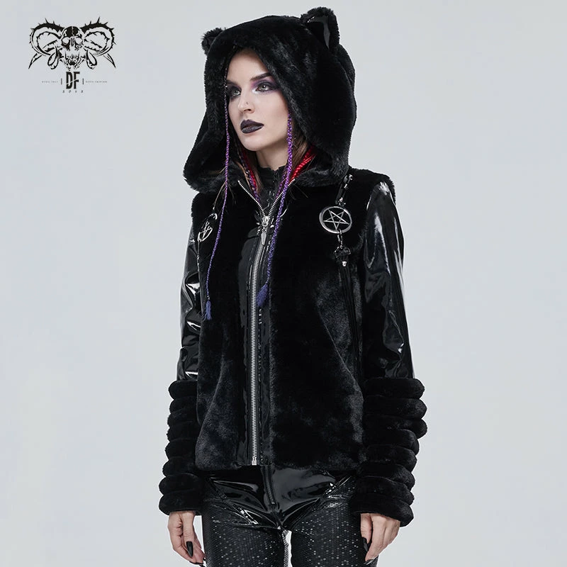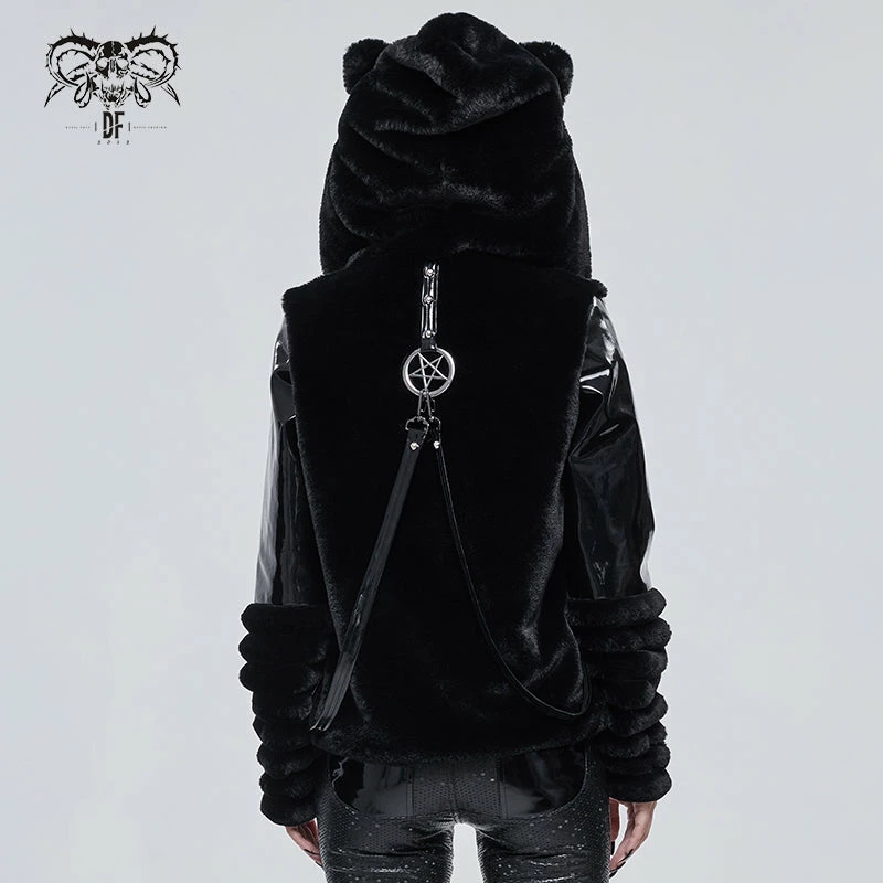 Stylish and gorgeous faux fur black hooded jacket from Devil Fashion. This must-have stunning jacket is made in a relaxed comfortable style that will flatter your figure to perfection while keeping you warm and cosy. This stunning jacket features zip front, metal pentagrams and strap detailing. The oversize fluffy hood also features cat ears! A must-have for your cold weather wardrobe!