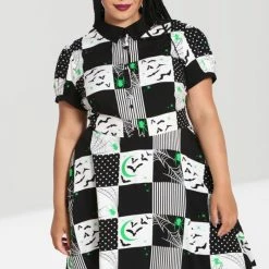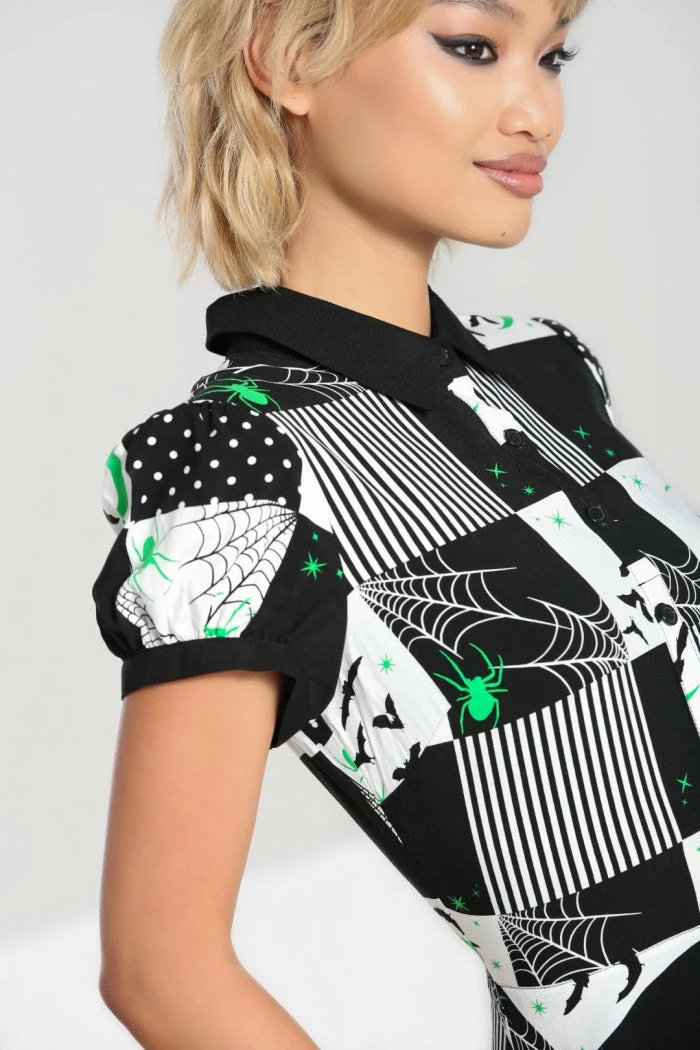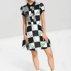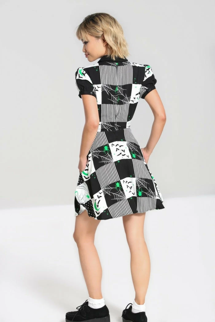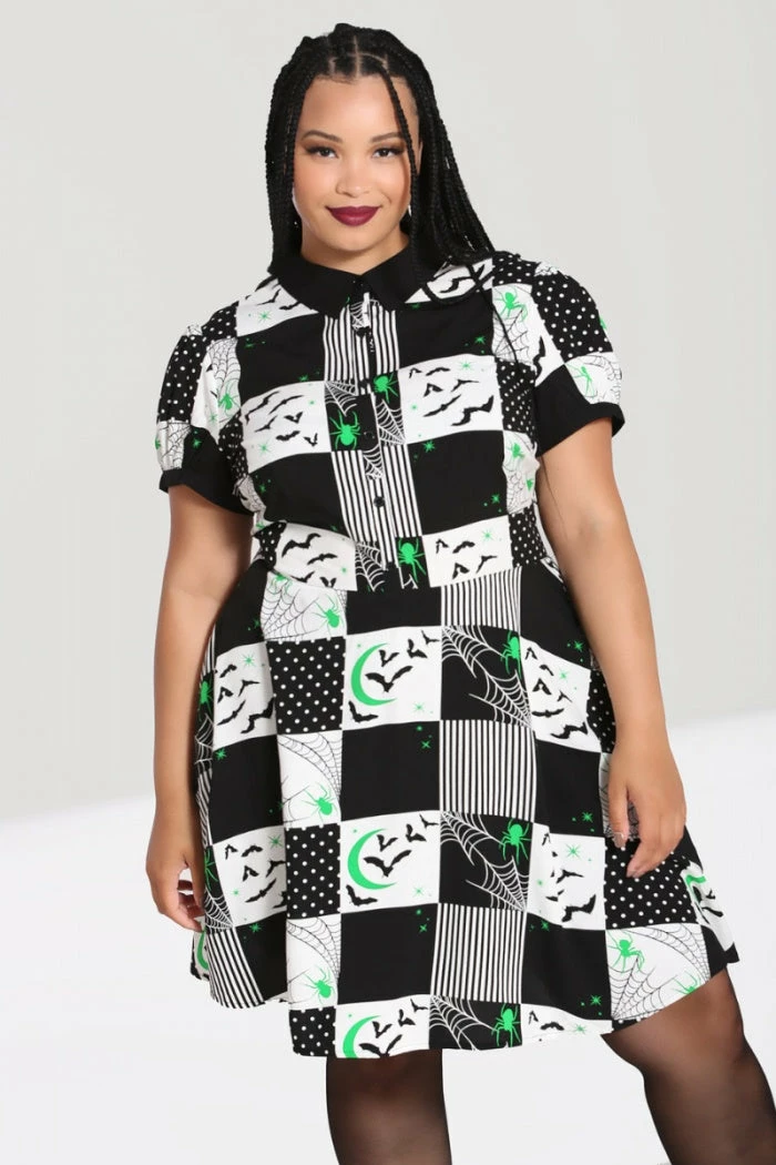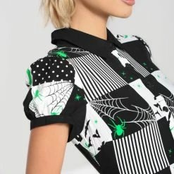 Stand-out black and white patchwork print mini dress with bright green contrast spooky print print from Hell Bunny. This awesome printed dress features cuffed short puff sleeves, statement black stand up pointed collar with front placket with buttons. This lovely dress is fitted at the waist and then flares out with back zip fastening. It looks great styled with high heels or chunky boots!