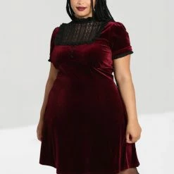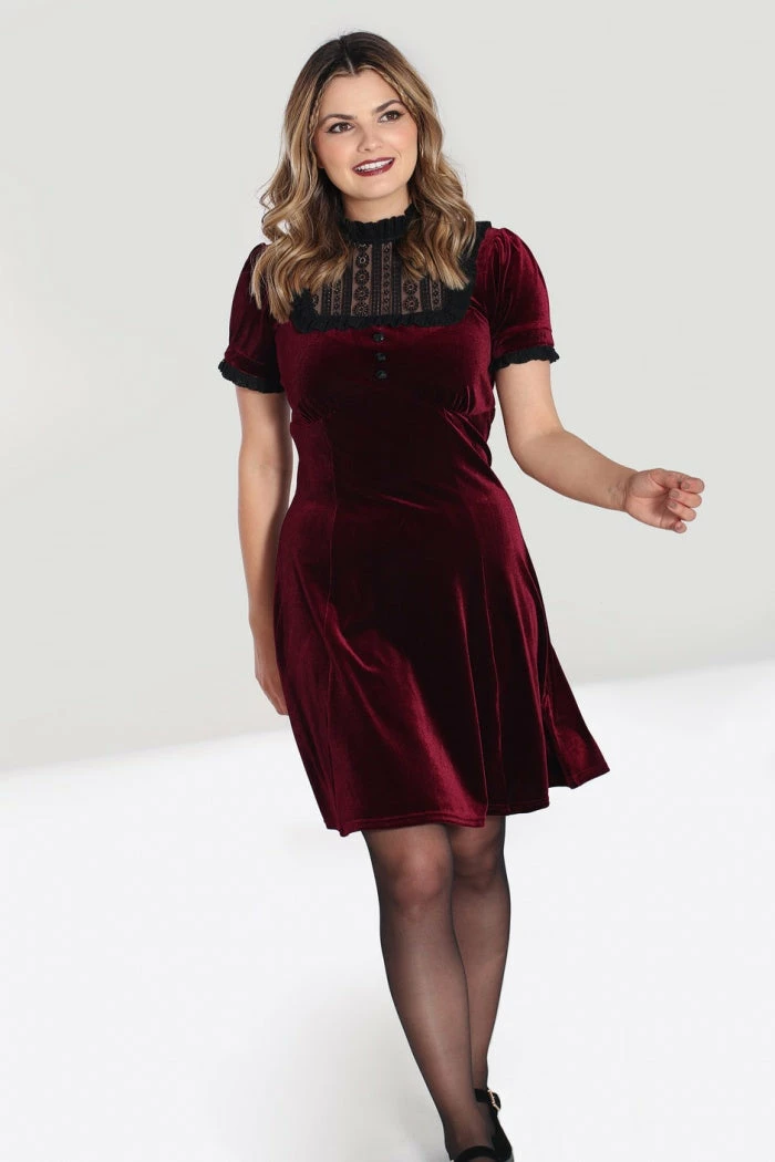 Gorgeous burgundy velvet midi dress from Hell Bunny. This awesome mid length wine colour party dress features short puff sleeves, black lace panel and frills with a keyhole fastening on the back of the neck. This lovely dress is made from a soft slight stretch velvet fabric, is fitted at the waist and then flares out. It looks amazing for a night out!