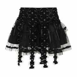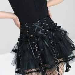 Gorgeous black tutu style mini skirt from Hell Bunny with hidden back zip fastening. This lovely skirt features a wide waistband to the hip and flares out from the mid hip with 3 layers of tulle plus lining for a tutu effect style. This amazing skirt also has long eyelet straps with D-ring detailing and corset style ribbon detailing and looks amazing on!