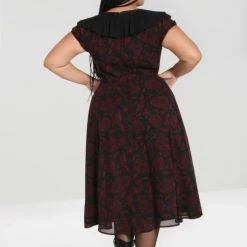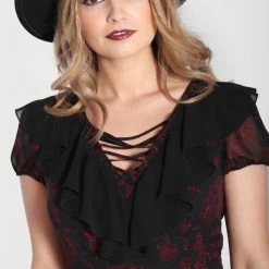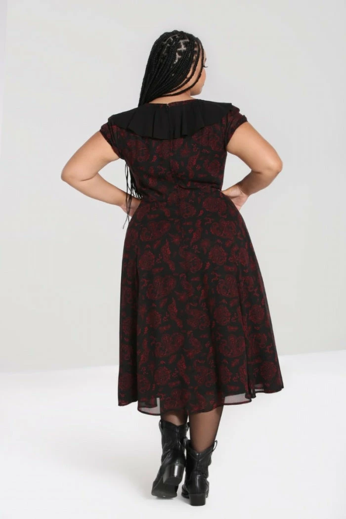 Gorgeous black chiffon maxi dress with red contrast snake and moon print from Hell Bunny. This awesome short sleeve dress features frills on the sleeves, ruffled V neckline with lace up detailing and fastens with a back zip. This lovely dress has an opaque black lining, is fitted at the waist and then flares out. It looks great dressed up or down!