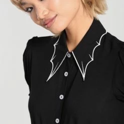 Stunning black blouse with bat wing collar from Hell Bunny in a glamorous semi fitted style. This gorgeous button up shirt features white contrast embroidery and short puff sleeves with elasticated edginn. The buttons are white contrast and the blouse looks awesome dressed up or down!