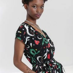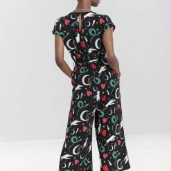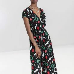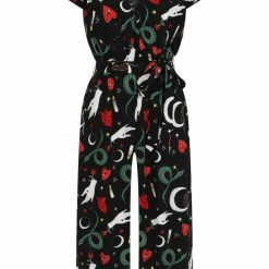 Stunning black button up jumpsuit with colourful contrast print and waist tie from Hell Bunny. This awesome jumpsuit features a vibrant snakes, candle, moons and hearts print, button up fastening with keyhole on the back and an elasticated waistband This lovely jumpsuit is fitted at the waist and then flares out into mid calf length trouser legs. It looks great dressed up or down!