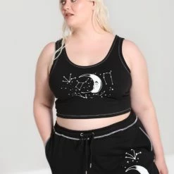 Amazing must-have black loungewear crop top from Hell Bunny with moon and stars design. This stunning crop top features a white contrast constellation print and contrasting white stitching! Perfect for lounging, this fitted top is made from a super soft and cosy cotton jersey and also features a low back with double cross strap detailing. Match perfectly with the Solaris Joggers!