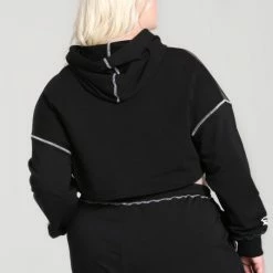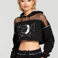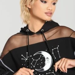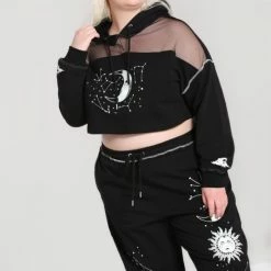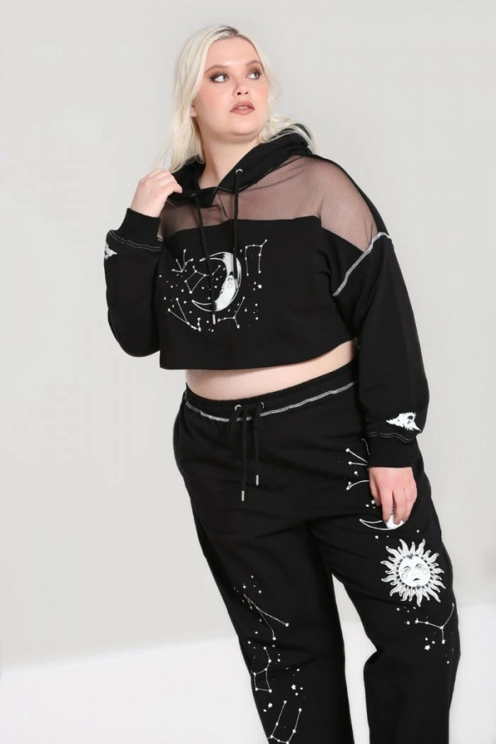 Awesome black loungewear cropped hoodie from Hell Bunny with constellation design. This stunning hoodie features white contrast moon and stars print and contrasting white stitching! Perfect for lounging, this hooded top is made from a super soft and cosy thick brushed stretchy cotton jersey and also features mesh detailing across the chest, and hood with drawstring and ribbed sleeve cuffs! Matches perfectly with the Solaris joggers!