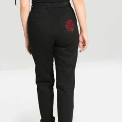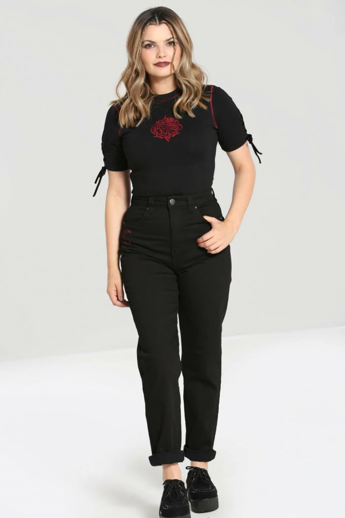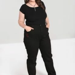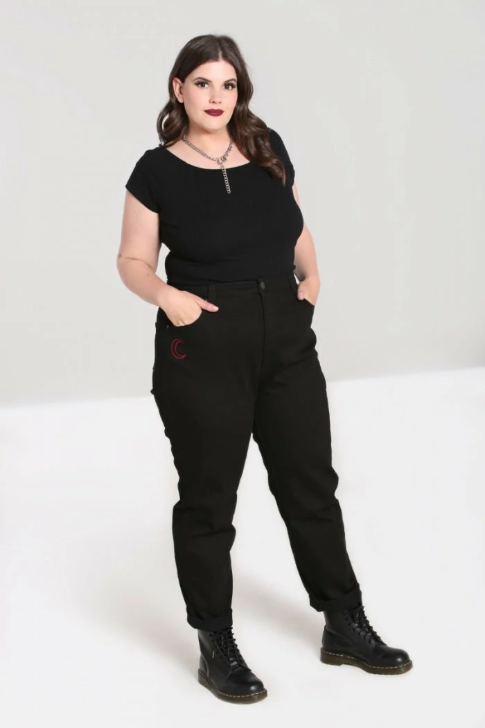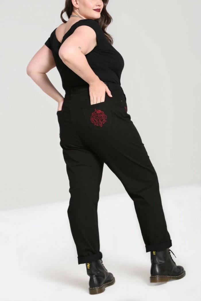 Stylish and versatile black jeans from Hell Bunny with red contrast moon and snake embroidery detailing. These must-have denim jeans feature belt loops, 2 front pockets and back pockets and have a tapered leg shape. These awesome black trousers are made from a slight stretch cotton fabric with metal button and zip fastening .