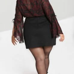 You’ll love this amazing black bodycon mini skirt from Hell Bunny with red snake and moon contrast embroidery. This gorgeous fitted mini skirt is made from a slight stretch cotton fabric that is fitted to show off those curves! Its also features a black ribbon lace up detailing on the front with silver metal eyelets, pointed seams and a hidden back fastening zip. Pairs amazingly with the Clarice blouse (shown) and looks great with chunky boots or high heels!