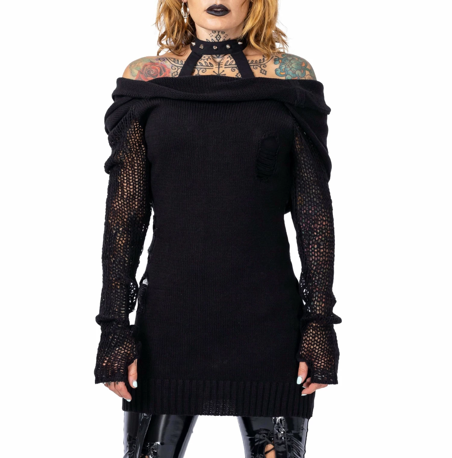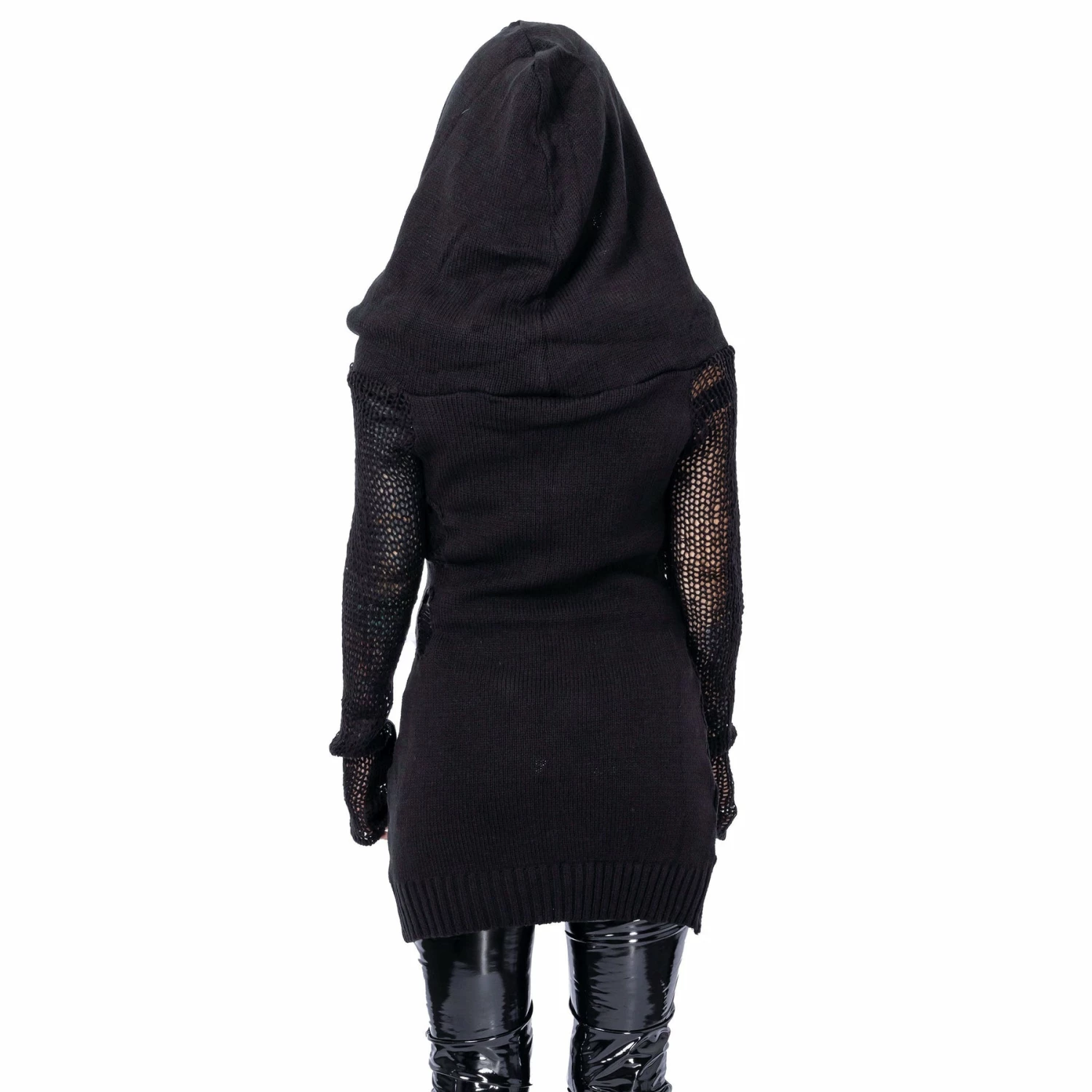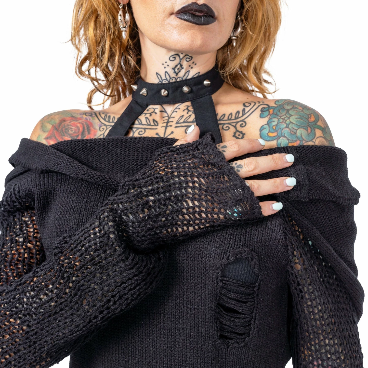 Must-have long black hooded top from Innocent. This stunning fitted sweater is made from a soft knitted fabric with distress detailing and loose knitted long sleeves with thumbholes. It also features a studded collar and can be worn with a cold shoulder style when the hood is down. Looks amazing on!