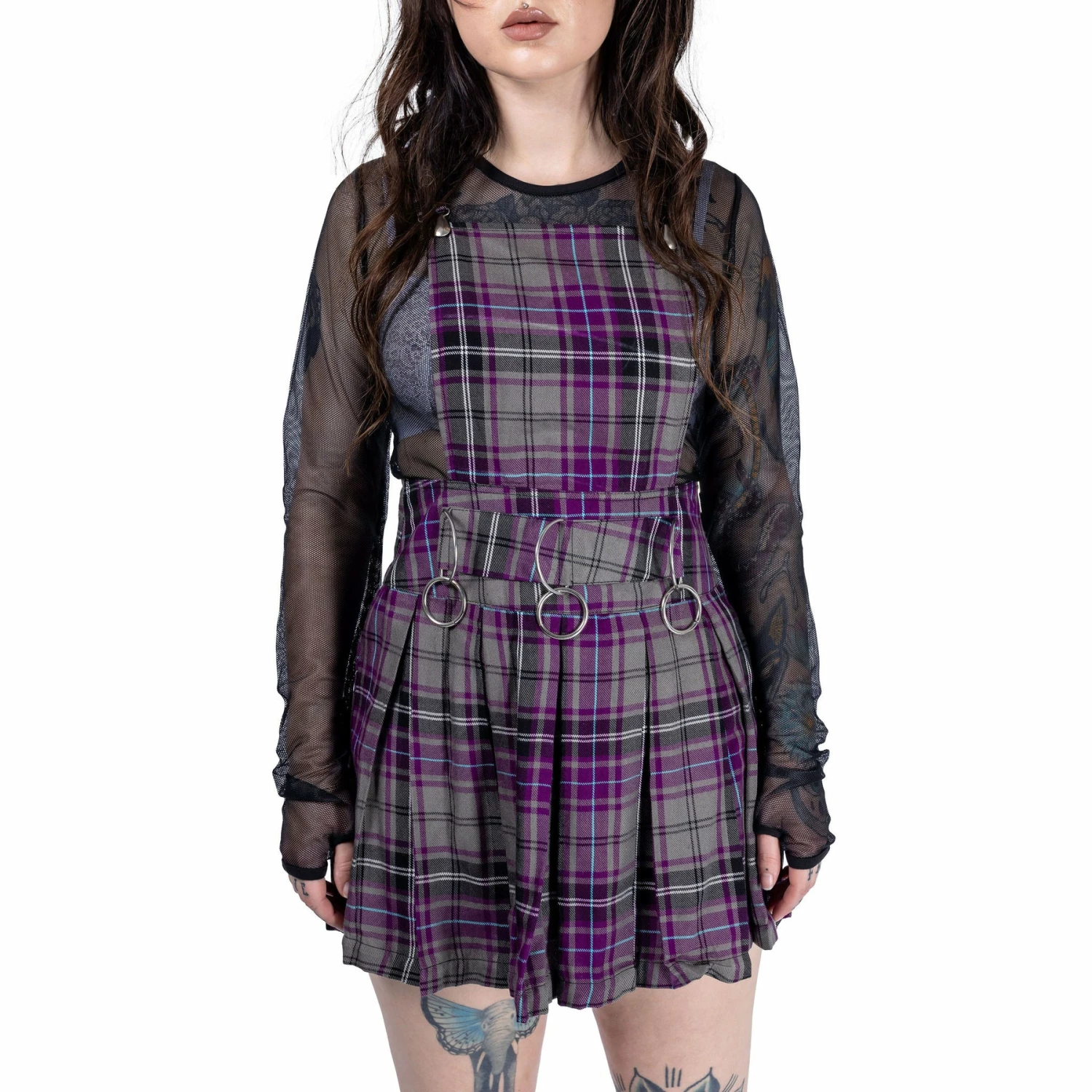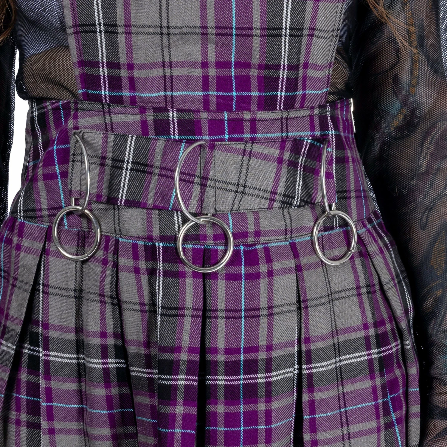 Stylish purple and gray tartan pinafore style mini dress from Innocent with pleated skirt. This must-have dress features a gathered in waist with metal hardware D rings and O rings. Made from a soft plaid fabric with adjustable straps and can be layered however you like. Looks awesome paired with chunky boots or your favourite heels!