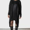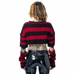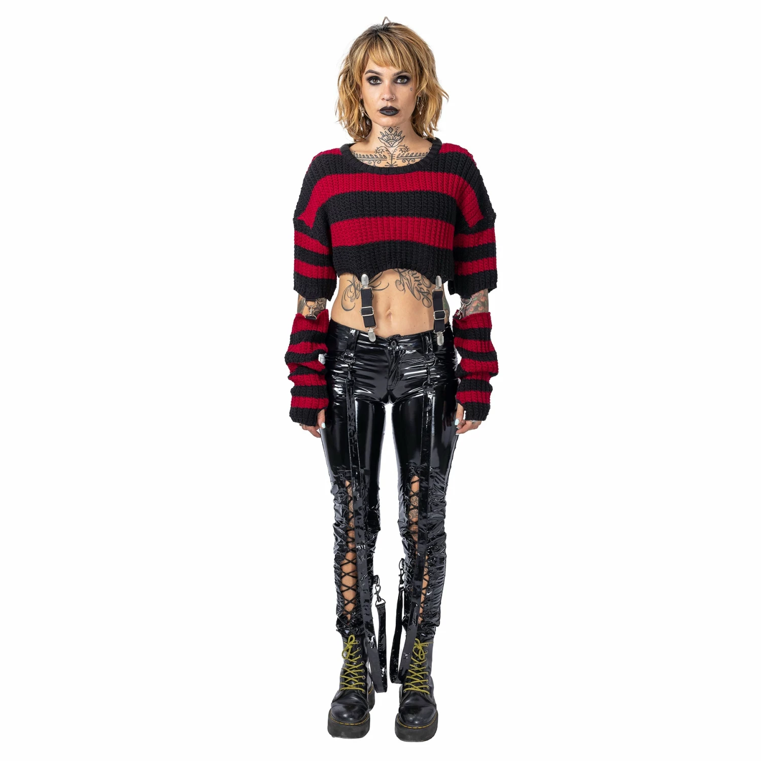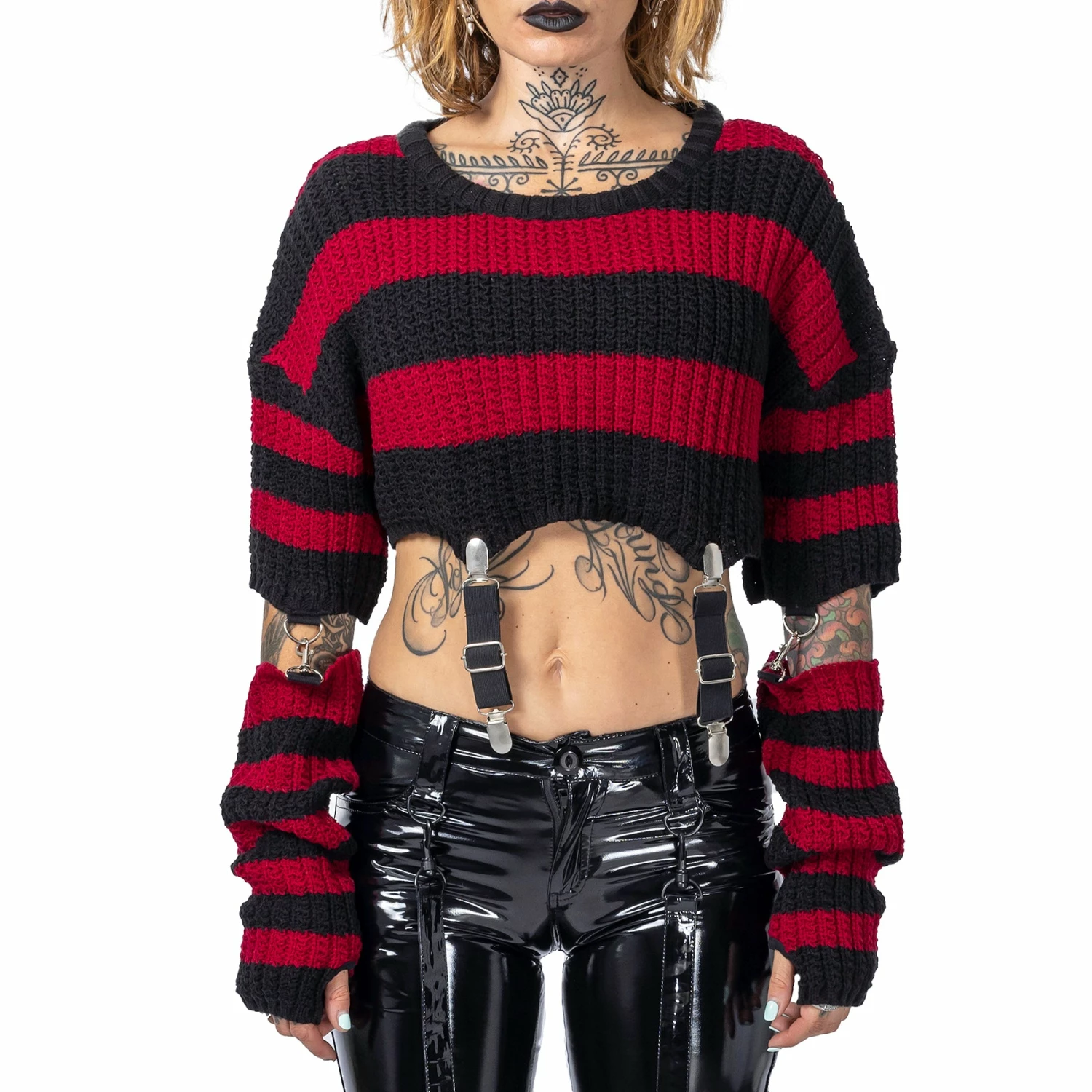 Stand-out cropped black and red horizontal stripe top from Innocent. This stunning fitted sweater is made from a soft knitted fabric with distress detailing and knitted long sleeves with split sleeves and thumbholes. It also features front bottom suspender straps / braces and metal hardware detailing. Looks amazing on!