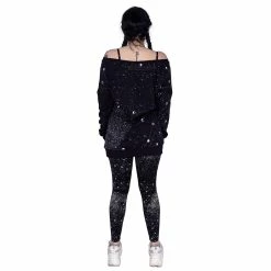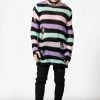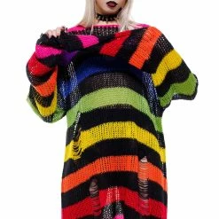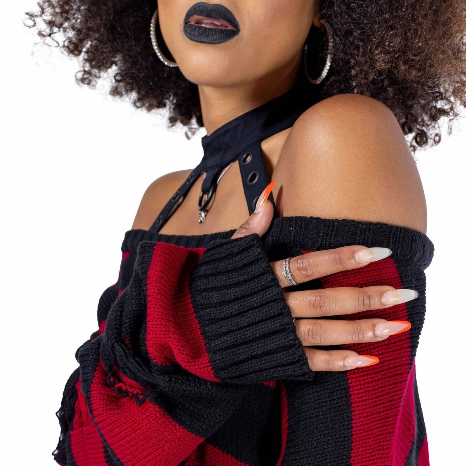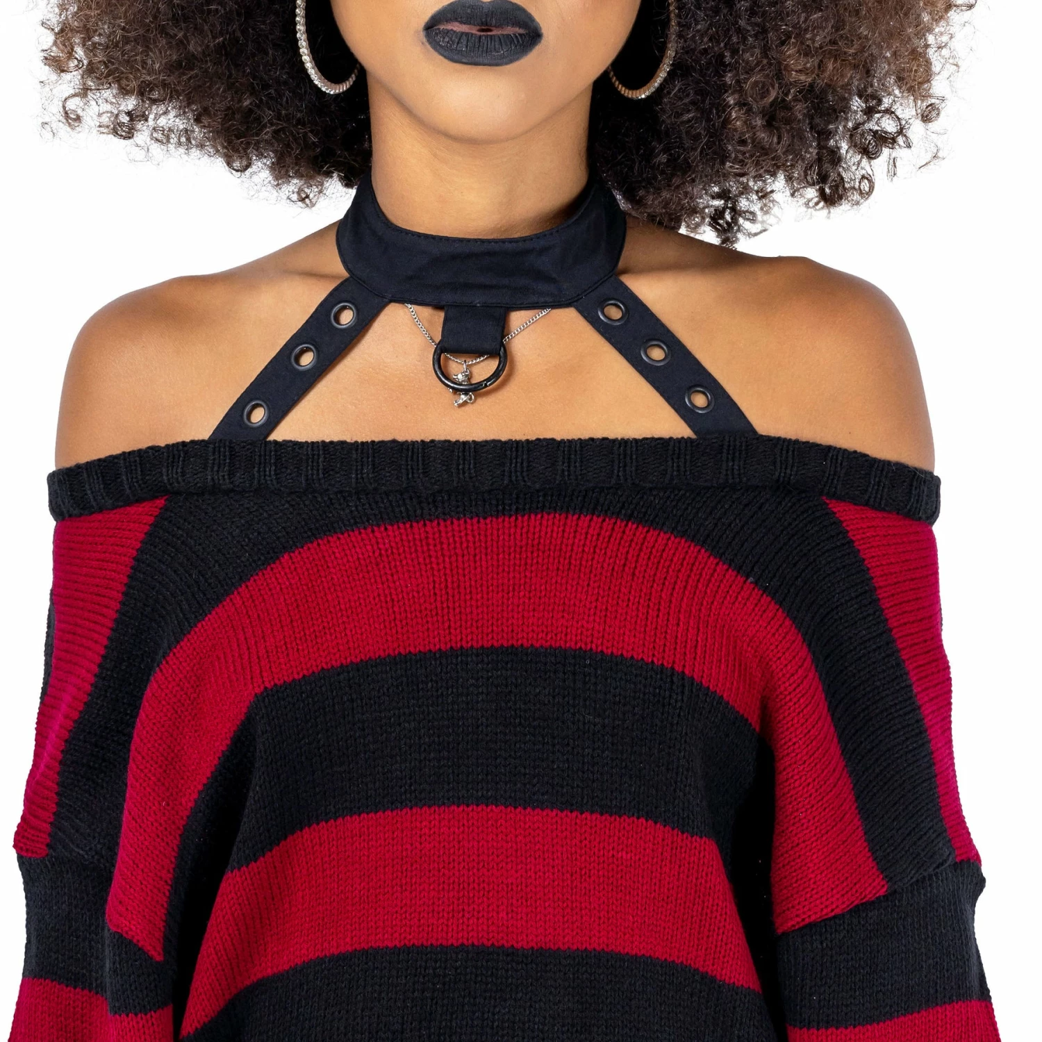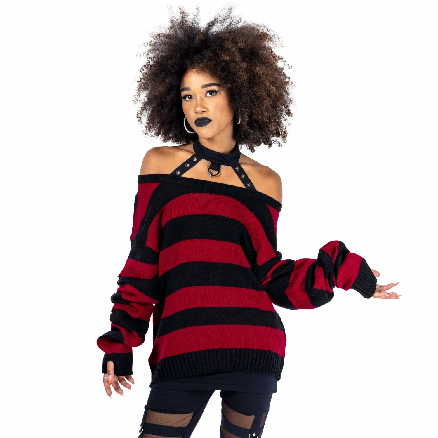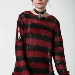 Must-have long black off the shoulder black and burgundy horizontal stripe top from Innocent. This stunning fitted sweater is made from a soft knitted fabric with distress detailing and knitted long sleeves with thumbholes. It also features a collar, metal hardware detailing and can be worn with a cold shoulder style. Looks amazing on!