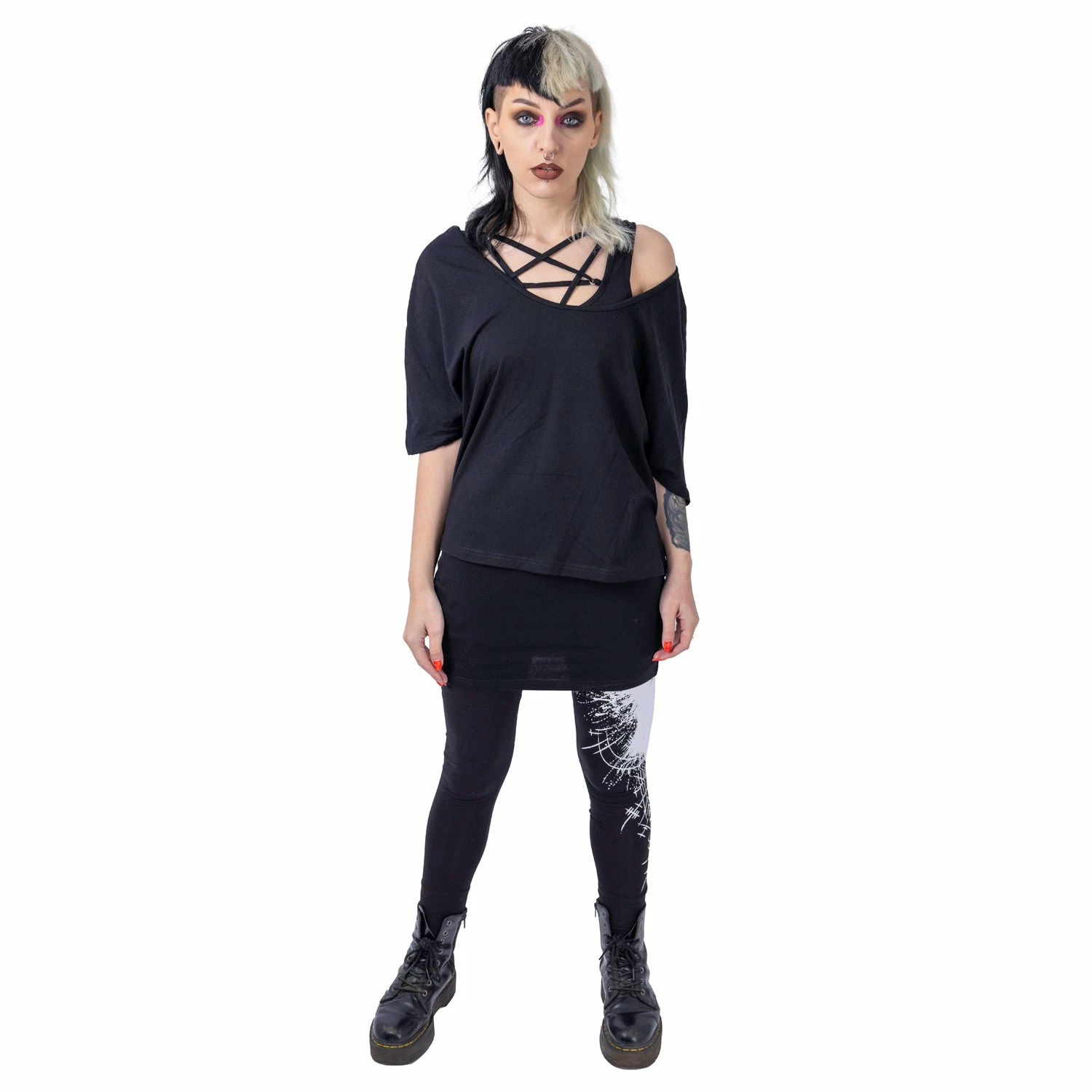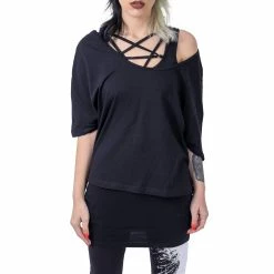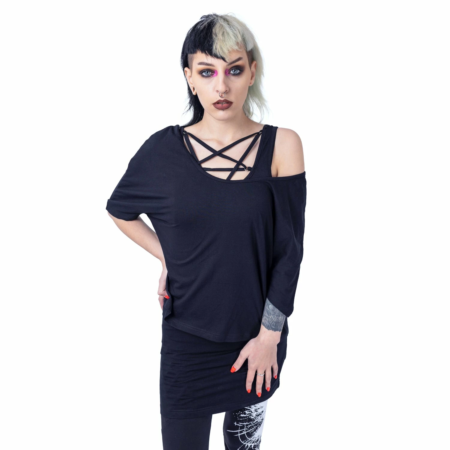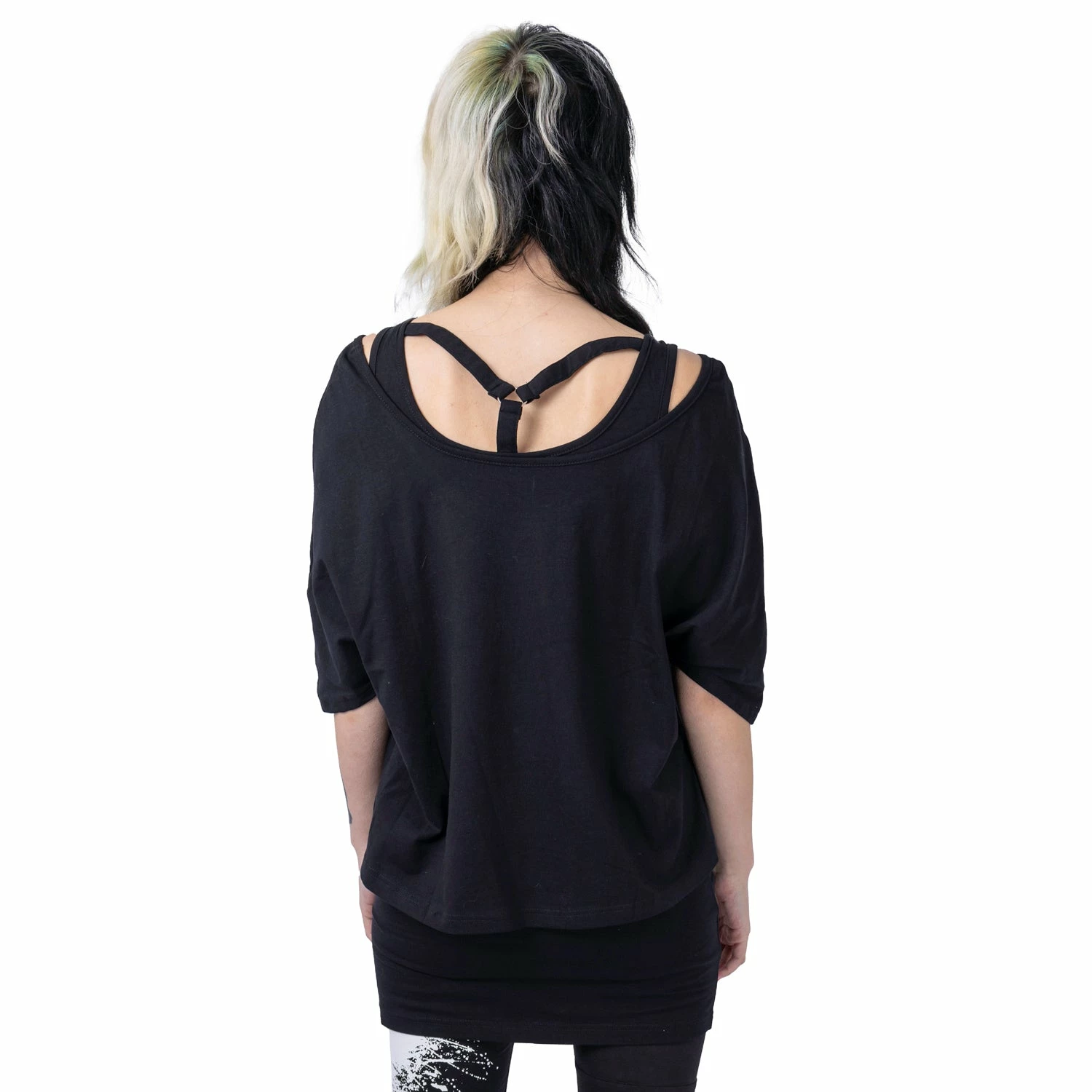 Versatile and stylish longline black top from Innocent. This must-have black top features statement strap designs. Made from a soft cotton fabric with a loose relaxed fit. Looks awesome paired with leggings and chunky boots or your favourite heels!