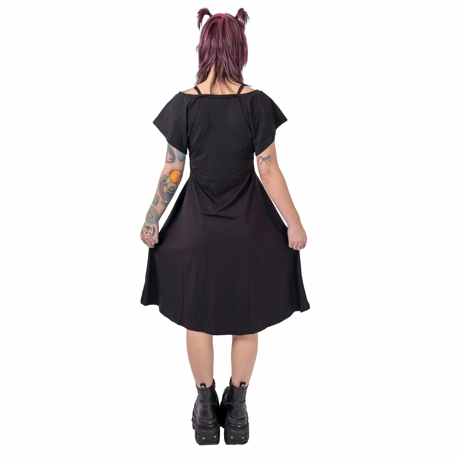 Lovely black short sleeved dress from Innocent with white contrast print. This must-have knee length dress features an asymmetric hem and lace up detailing on the front. Made from a soft stretch cotton fabric that is fitted to flatter your figure with an elegant flowing skirt. Looks awesome paired with chunky boots or your favourite heels!
