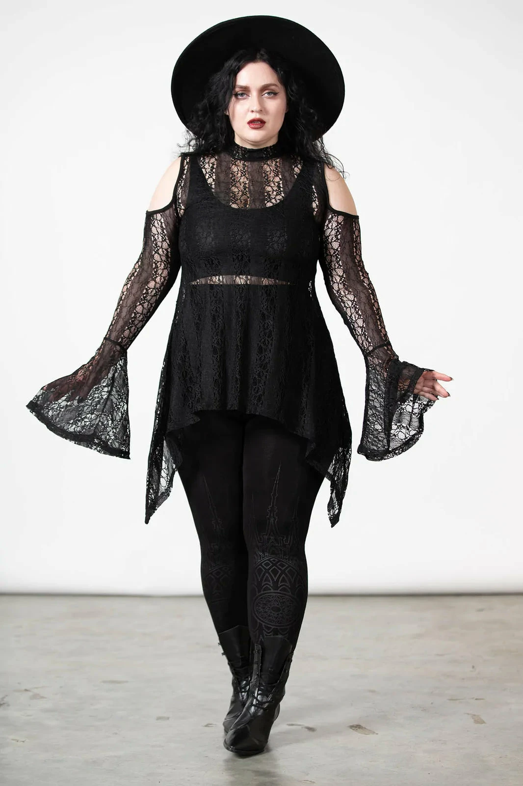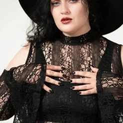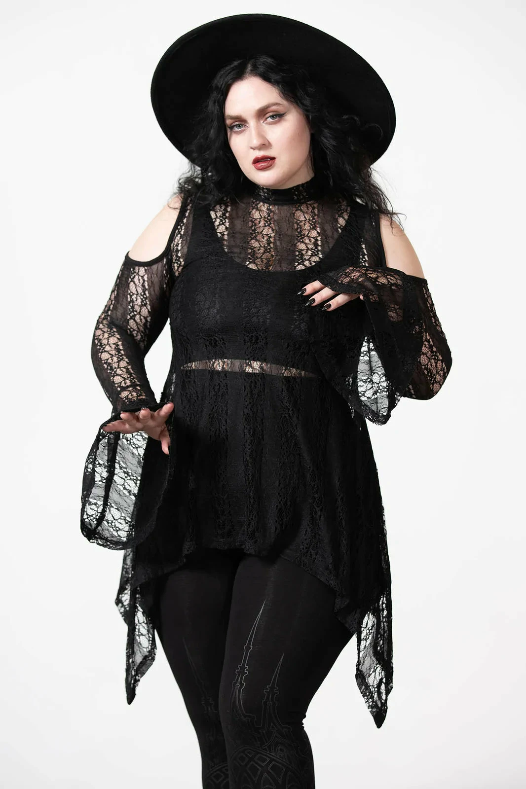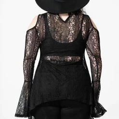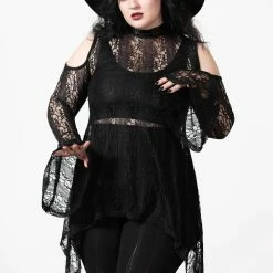 Gorgeous gothic long sleeve see-through lace black top from Killstar with cold shoulders and bell sleeves! This beautiful and stylish top is made from a soft stretchy striped lace fabric which is fitted to flatter those curves with a long flowing style with hanky hem! Looks amazing on with a high neck with button closure!