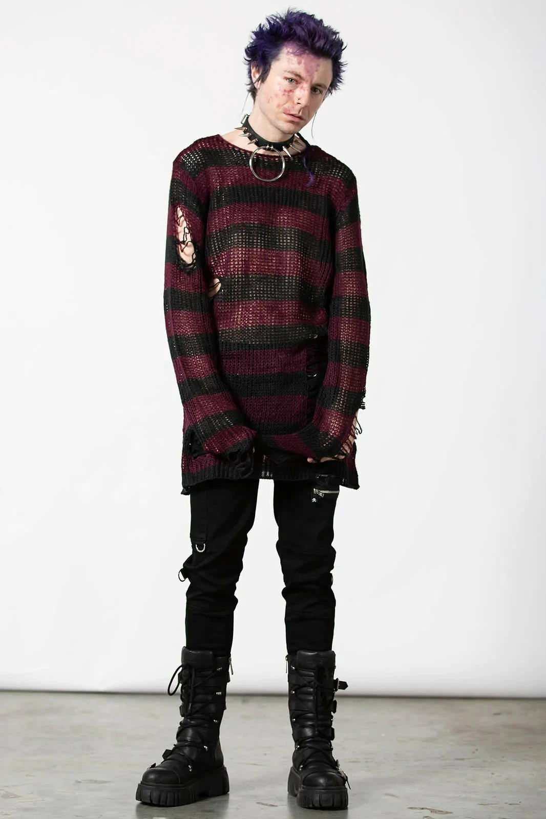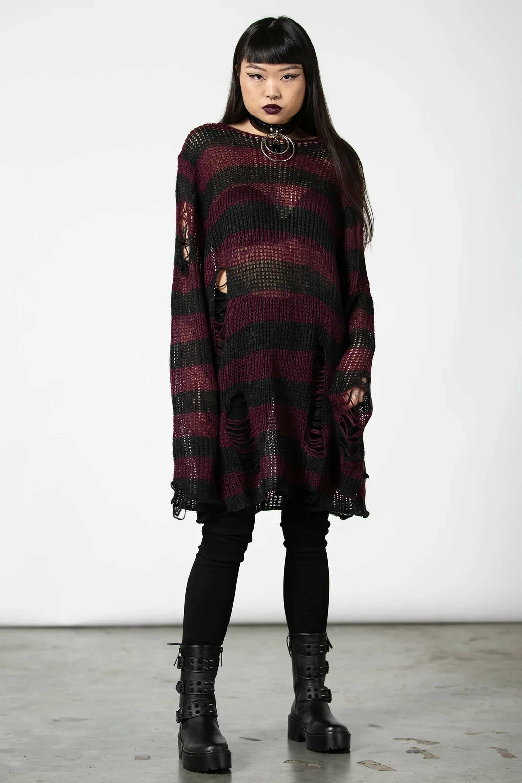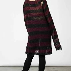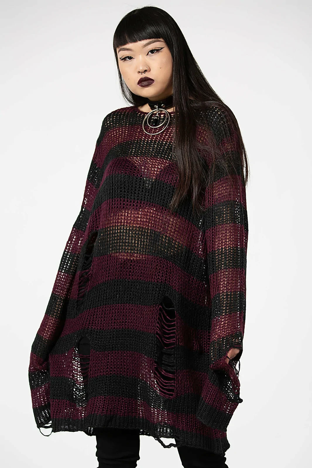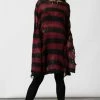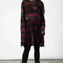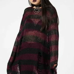 Killstar Cassius Knit Sweater is a black and currant contrast stripe sweater made from soft knitted fabric that looks great on everyone! This unisex soft knitted jumper features distress detailing, relaxed fit and extra long length. This statement piece looks stunning dressed up or down!