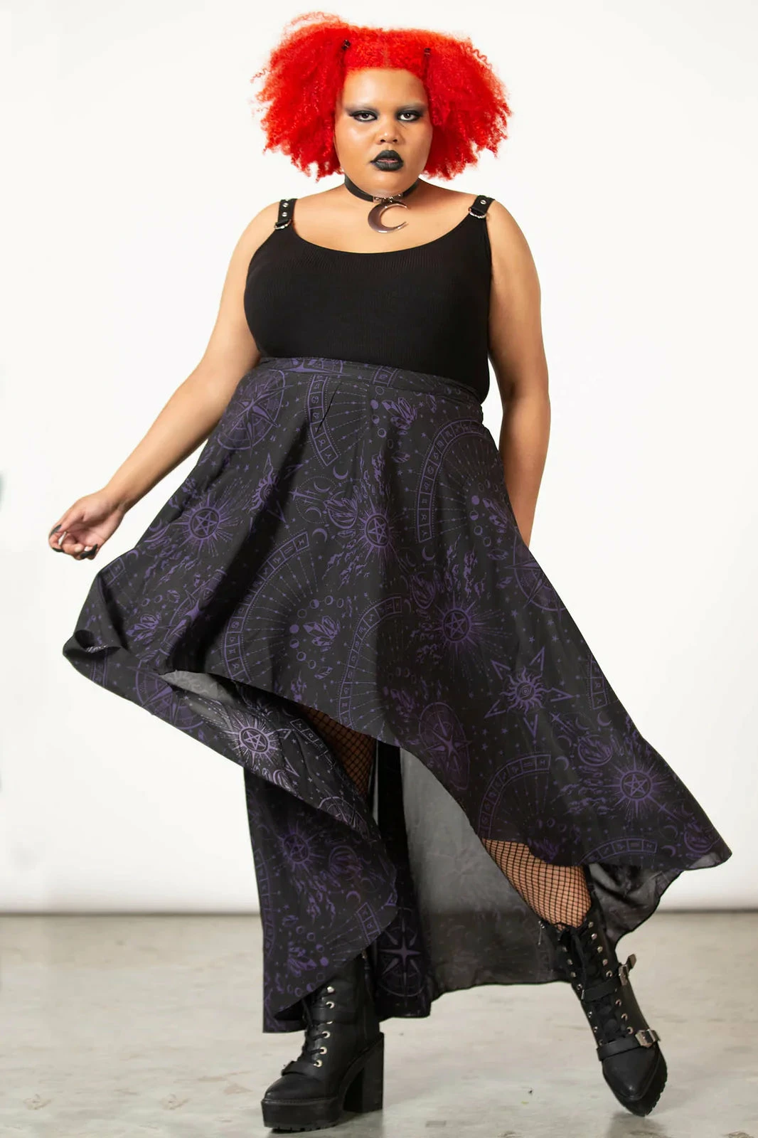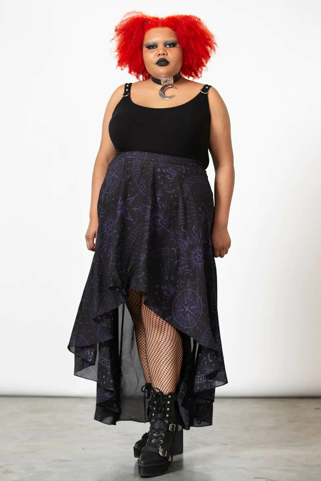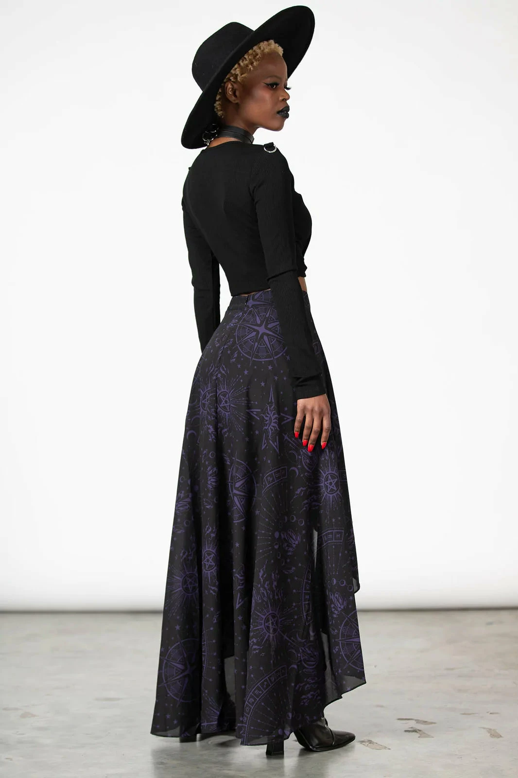 Beautiful black celestial print maxi skirt from Killstar with opaque mini skirt lining and waterfall hem! This gorgeous skirt is made from a super soft stretchy fabric, which is fitted to show off those curves with opaque under slip! This stunning black skirt features a standout astrological print and has a hidden back zip!