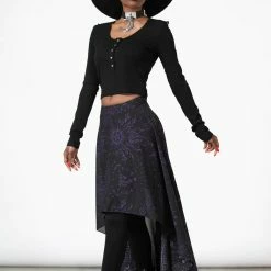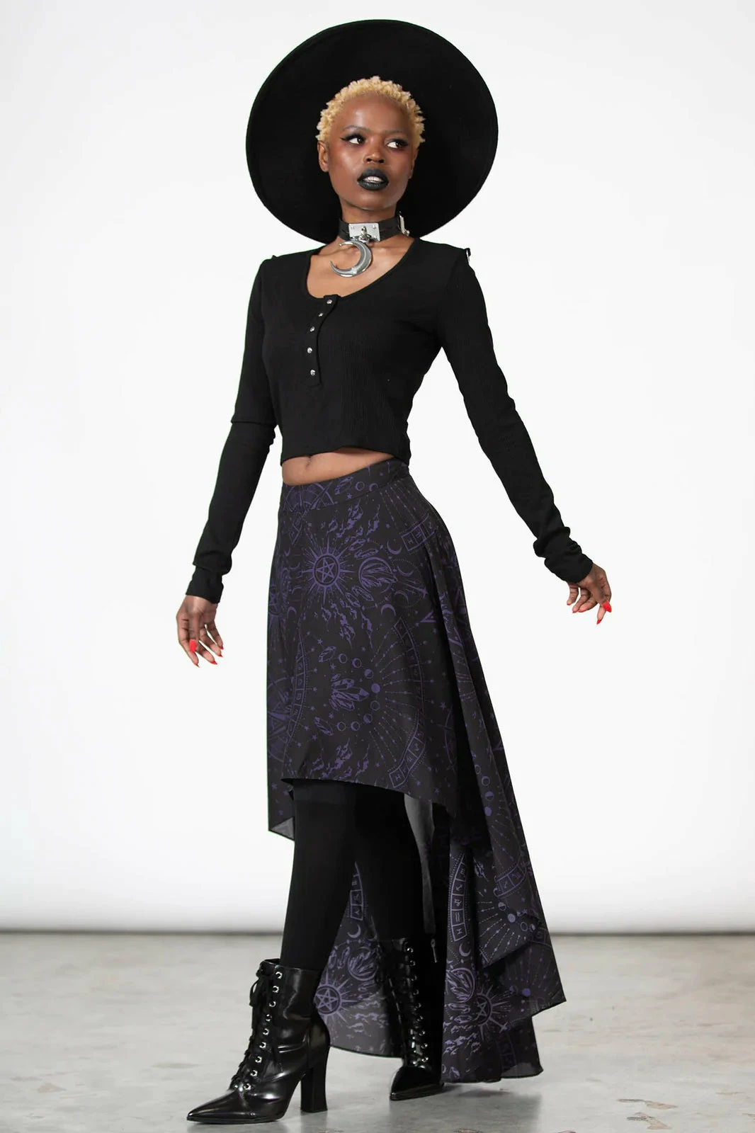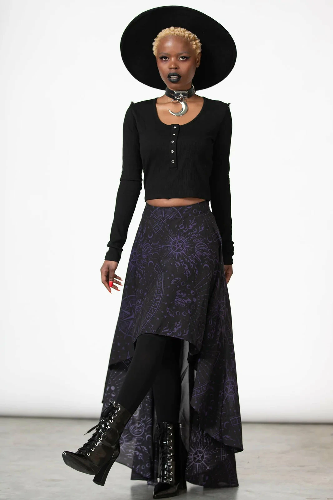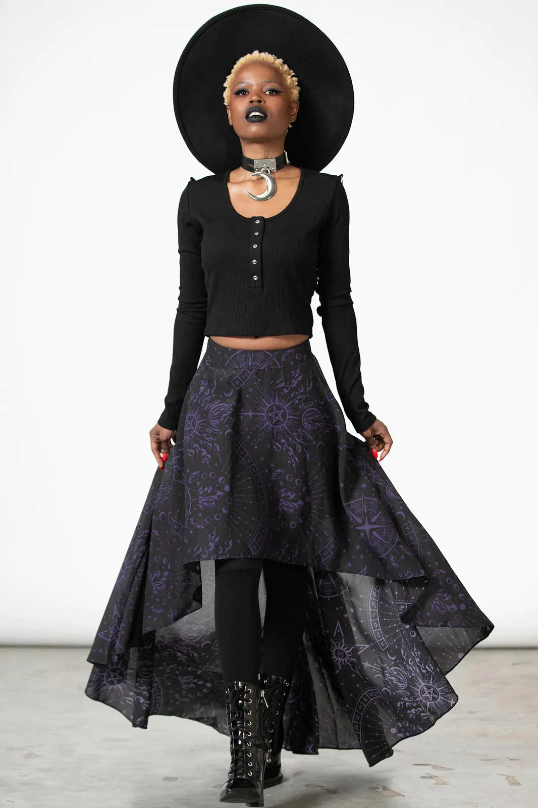 Beautiful black celestial print maxi skirt from Killstar with opaque mini skirt lining and waterfall hem! This gorgeous skirt is made from a super soft stretchy fabric, which is fitted to show off those curves with opaque under slip! This stunning black skirt features a standout astrological print and has a hidden back zip!