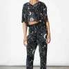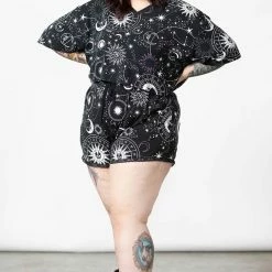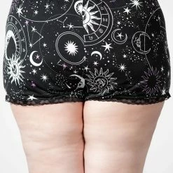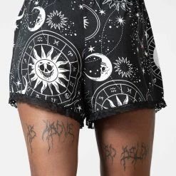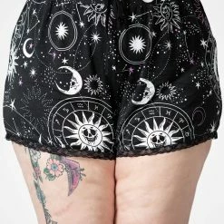 Playful and comfy black pj shorts from Killstar with bold white contrast gothic celestial pattern and stretch lace trim! These must-have lounge shorts are made from a soft stretchy fabric with elasticated waistband for a comfortable yet flattering silhouette! The perfect thing for lounging in style, get the Cosmos cami or tops for the complete pyjamas outfit!
