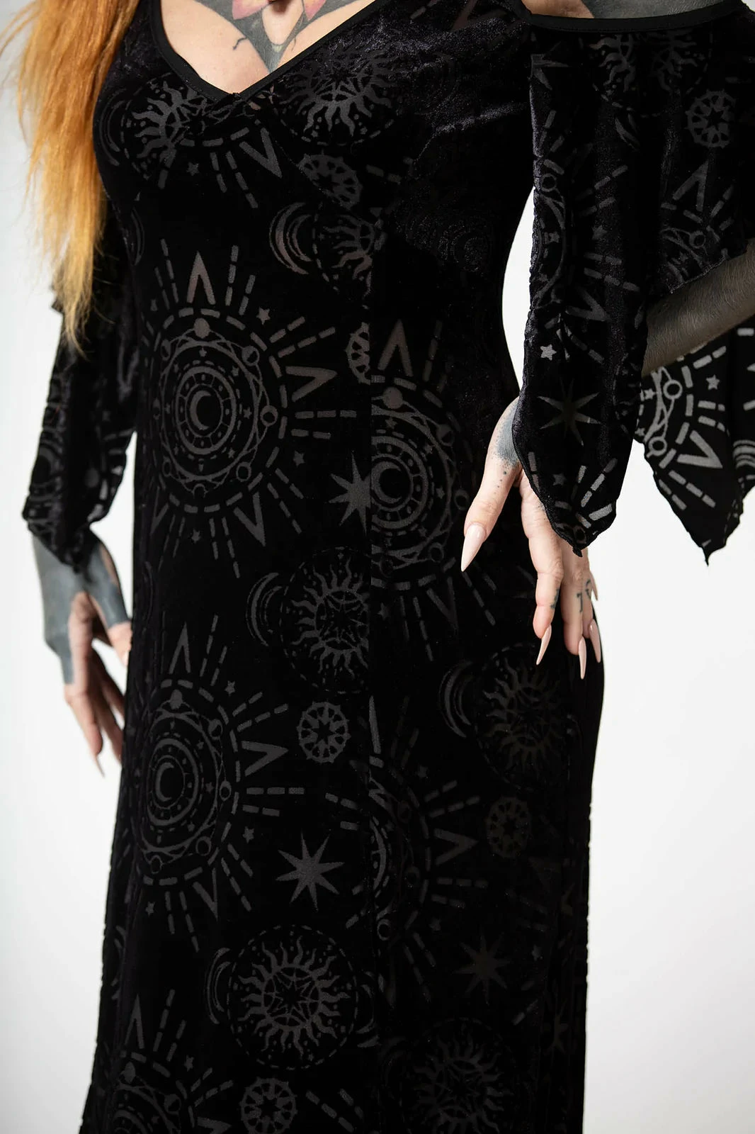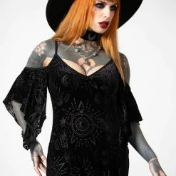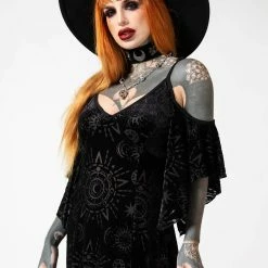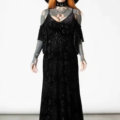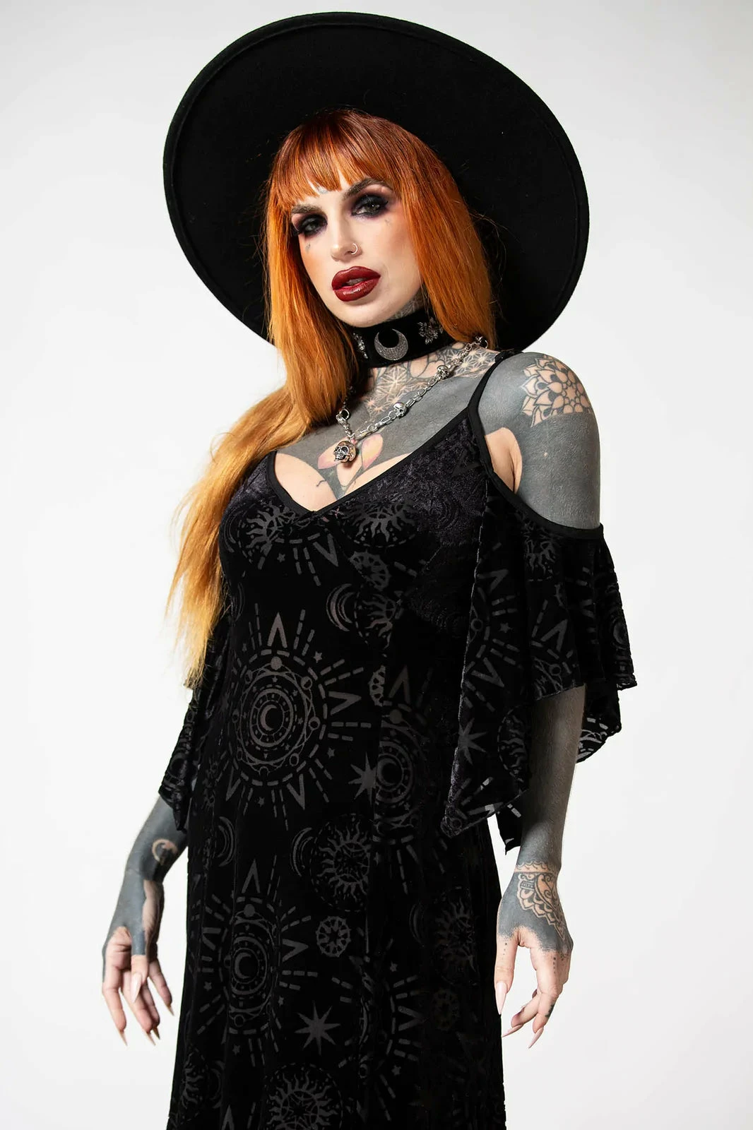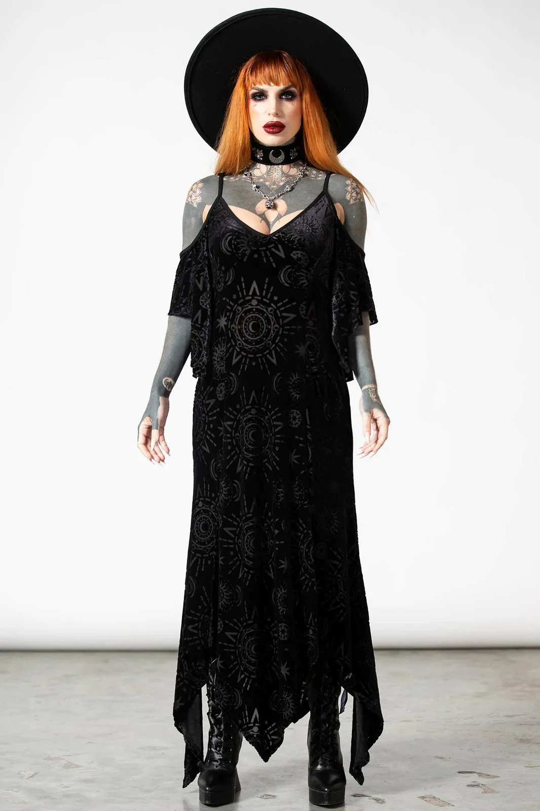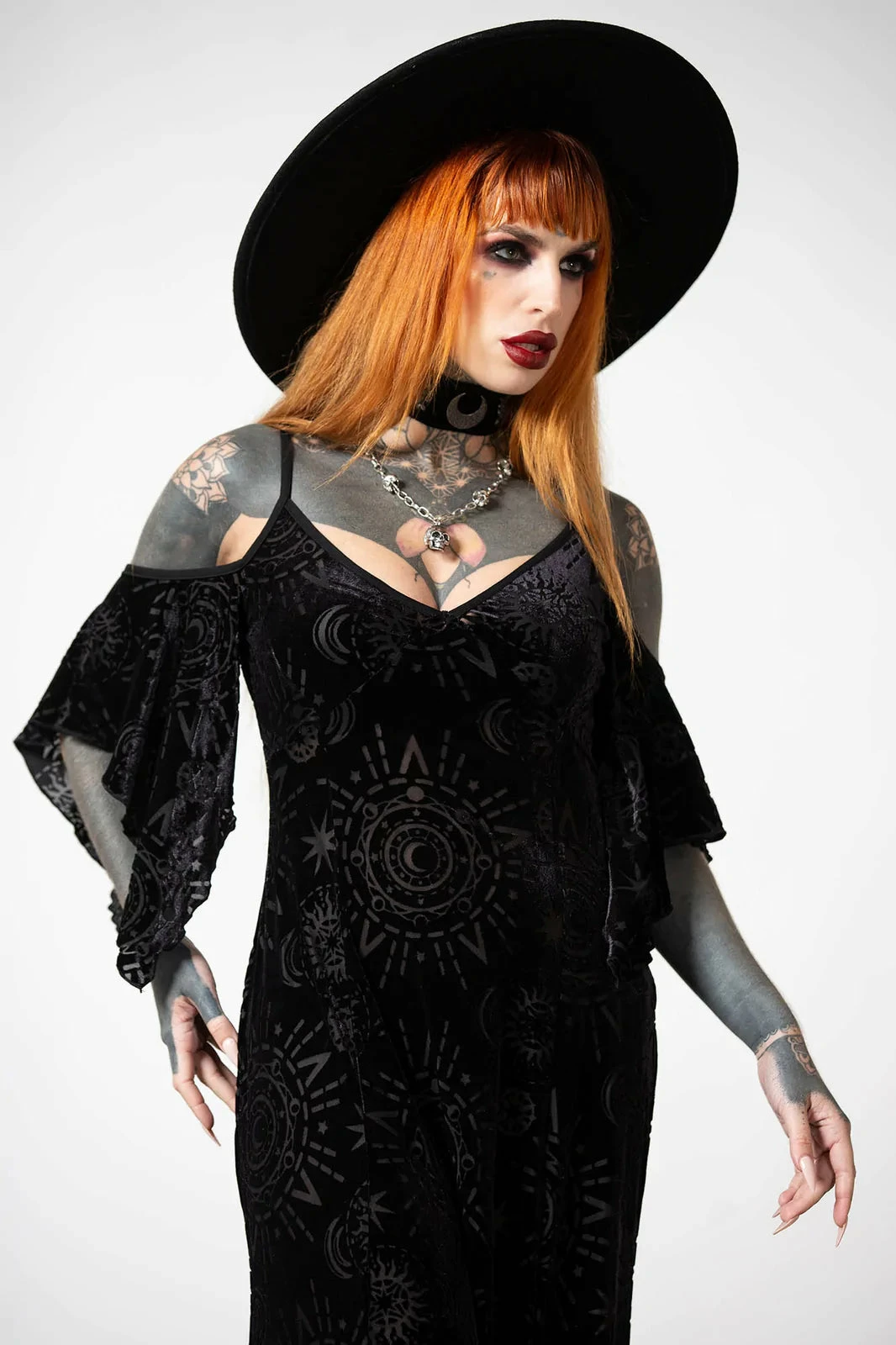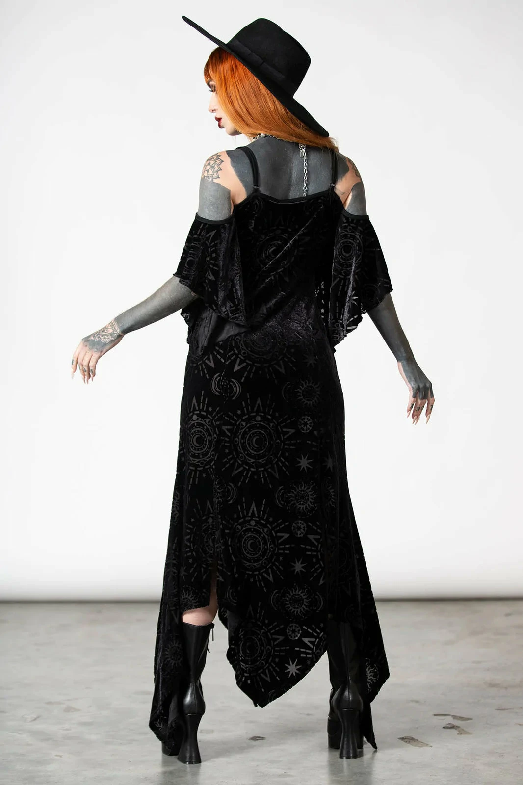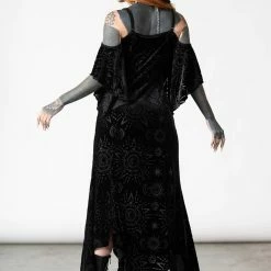 This showstopping black velvet maxi dress from Killstar is created with enchanting luxe soft touch velvet with a statement burnout pattern and dropped hem. This fitted 3/4 length sleeve dress features a V neck with cold shoulder and thin adjustable shoulder straps with long flowing hanky hem detailing on the sleeves and skirt that is sure to captivate!