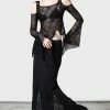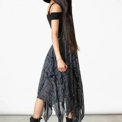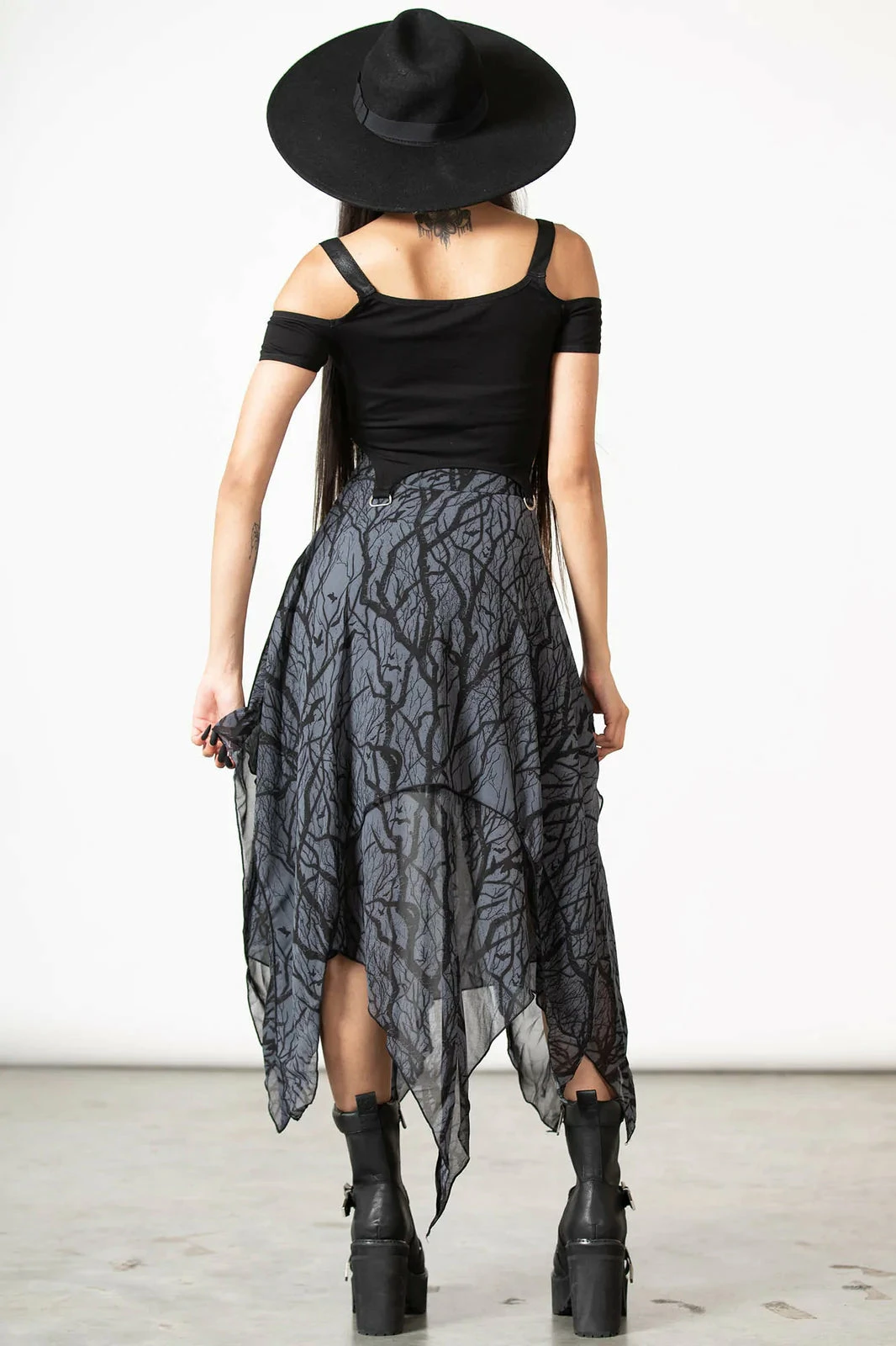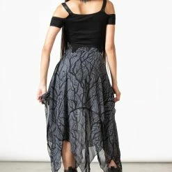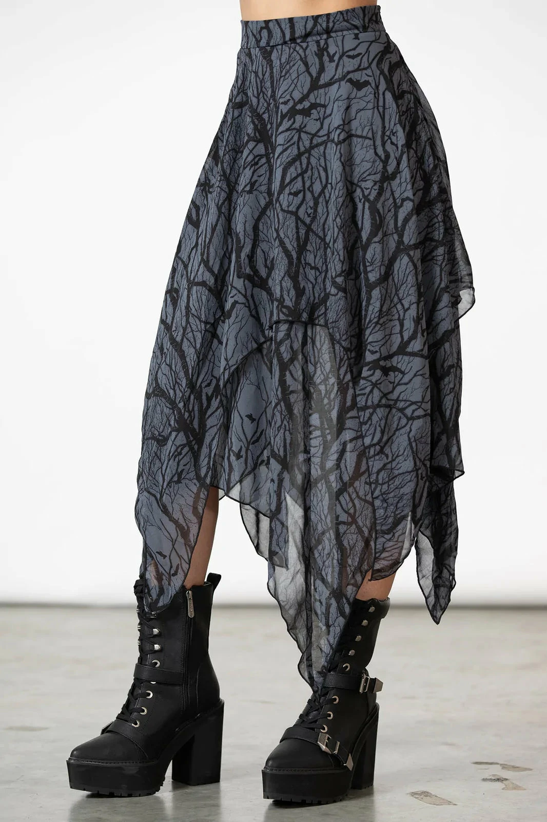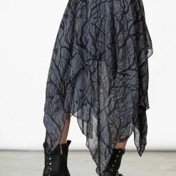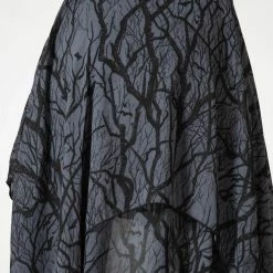 Floaty black and gray layered maxi with a statement contrast print that evokes a bleak winter woodland forest landscape from Killstar. This stunning skirt is made from a soft non stretch mesh fabric over an opaque lining with flowing hanky hems and hidden side zip closure. Looks amazing worn with high heels or chunky boots!