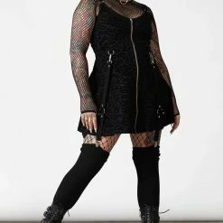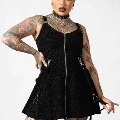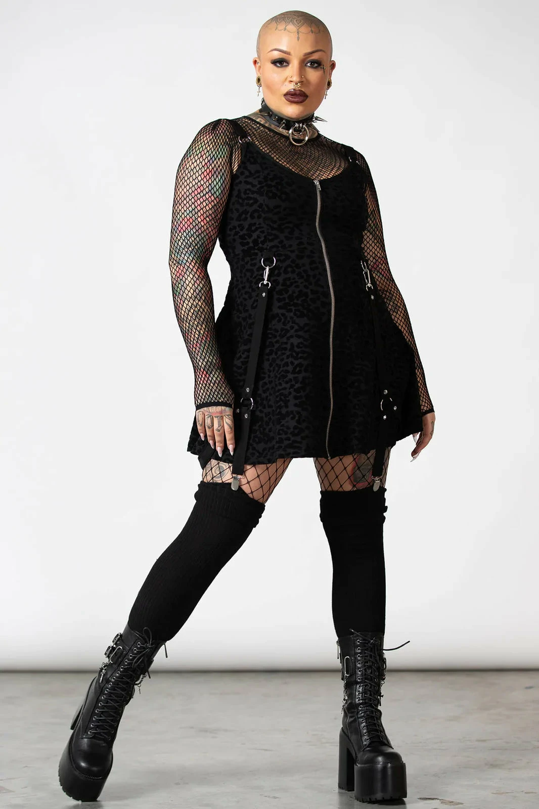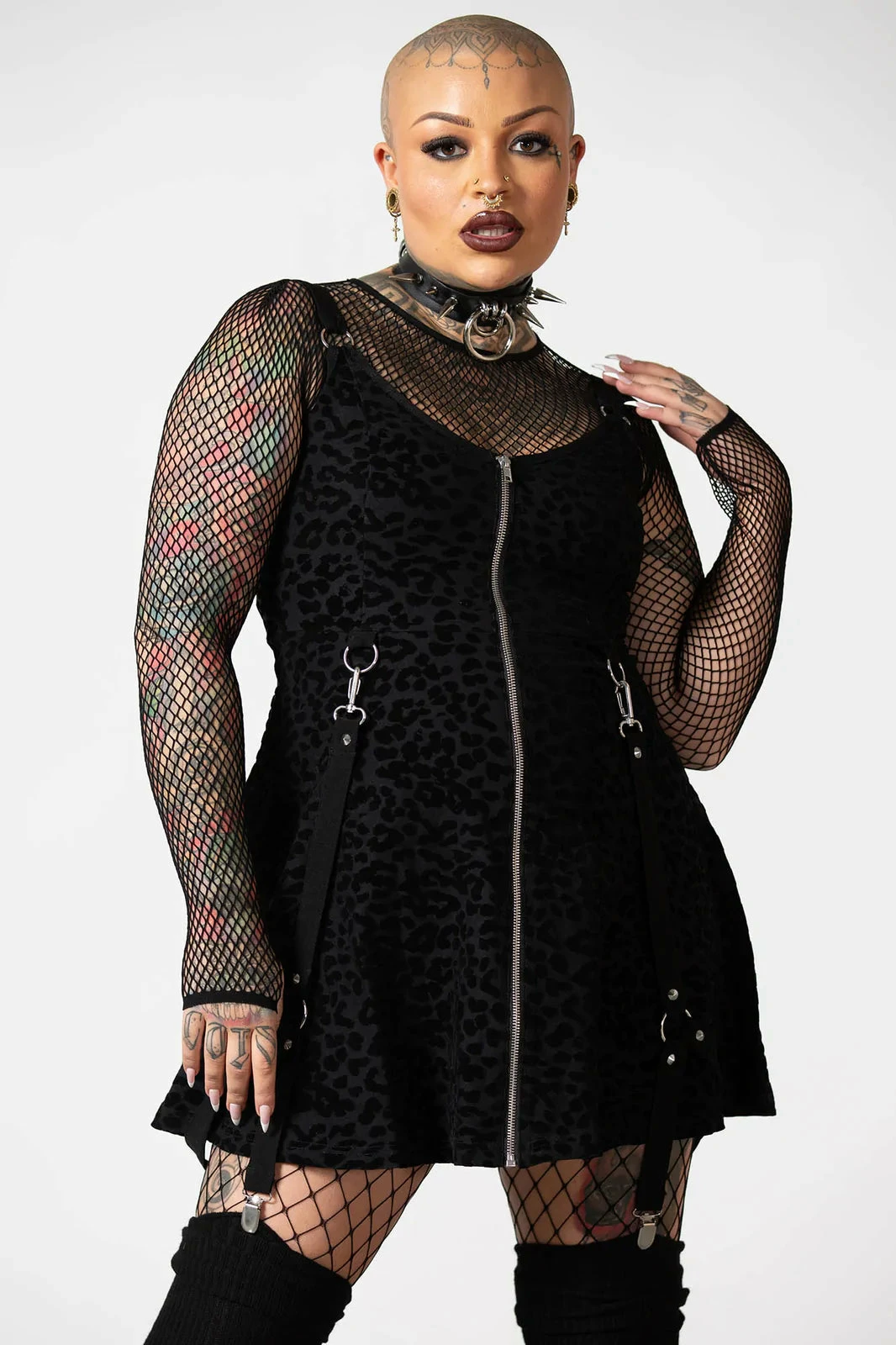 Purrfectly stunning black velvet mini dress from Killstar that is made from a luxuriously soft stretchy embossed velvet fabric with statement leopard print pattern that will give you the ultimate comfort and fitted body hugging style. This must-have skater dress features a full front zip, detachable straps with statement metal hardware and looks awesome paired with chunky boots or heels!