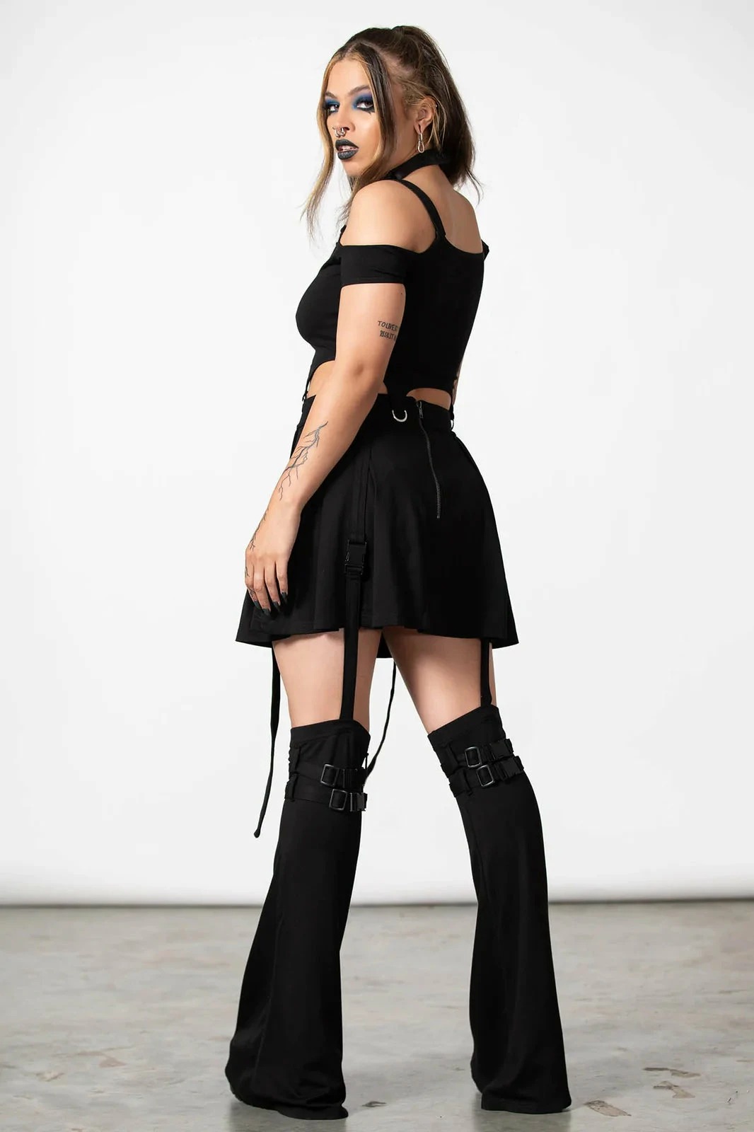 This stunning black A-line mini skirt from Killstar is made from a soft stretchy fabric and comes with awesome detachable flared leg warmers. It also features statement black metal buckles! Sure to turn heads and can be worn with or without the leg warmers depending on your look!