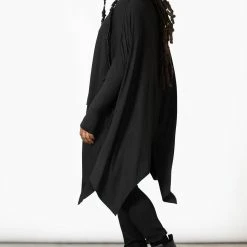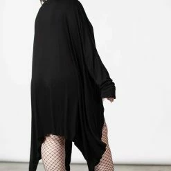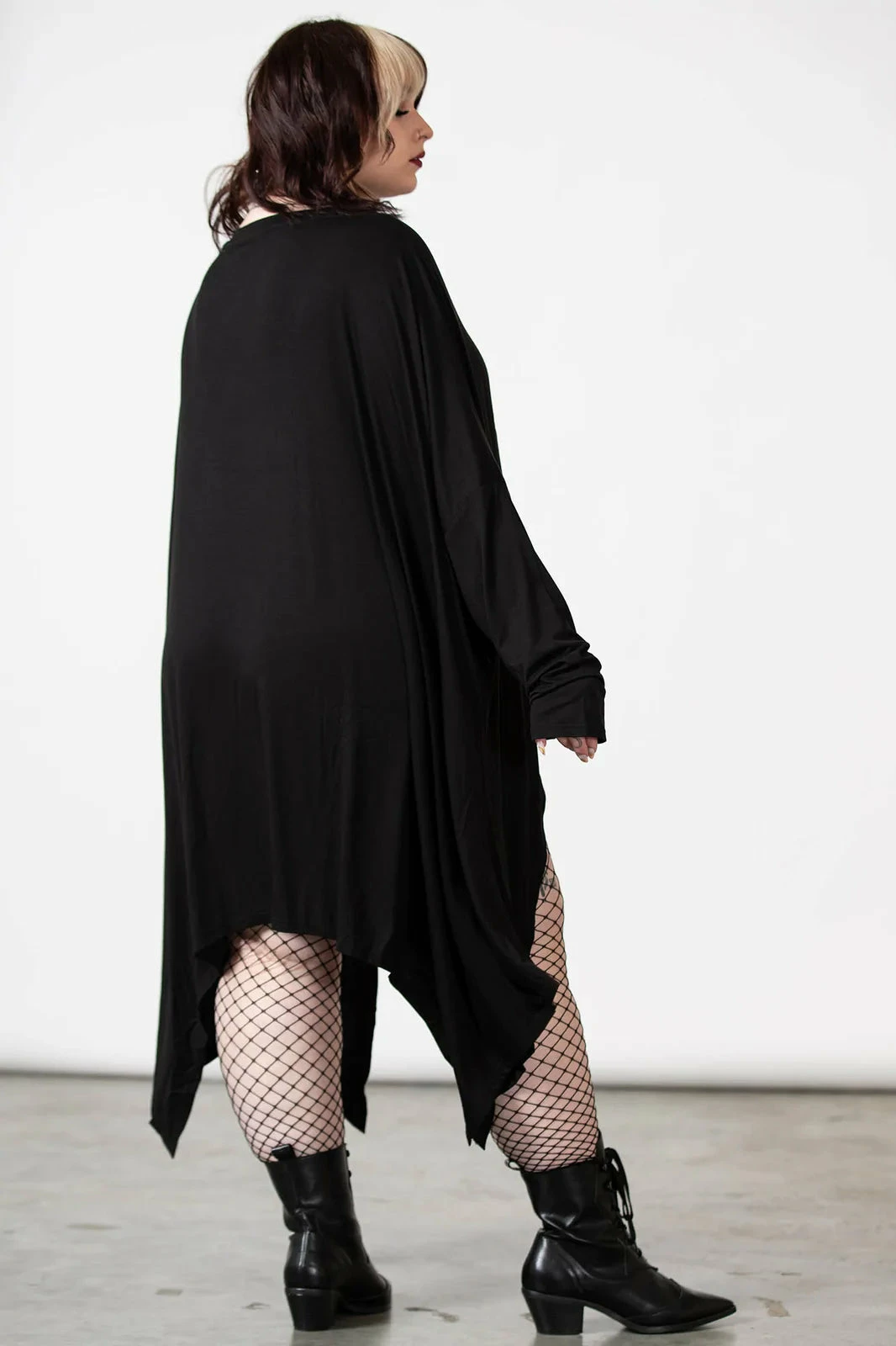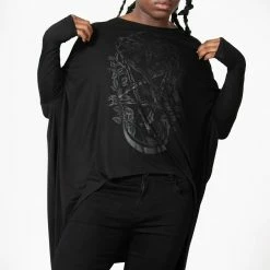 Stunning oversize black long sleeve top made from soft fabric that looks great on everyone! This soft relaxed draping fit top features long sleeves and extra long hanky hem. This statement piece also features a statement black on black contrast print with pentagram, and looks stunning dressed up or down!
