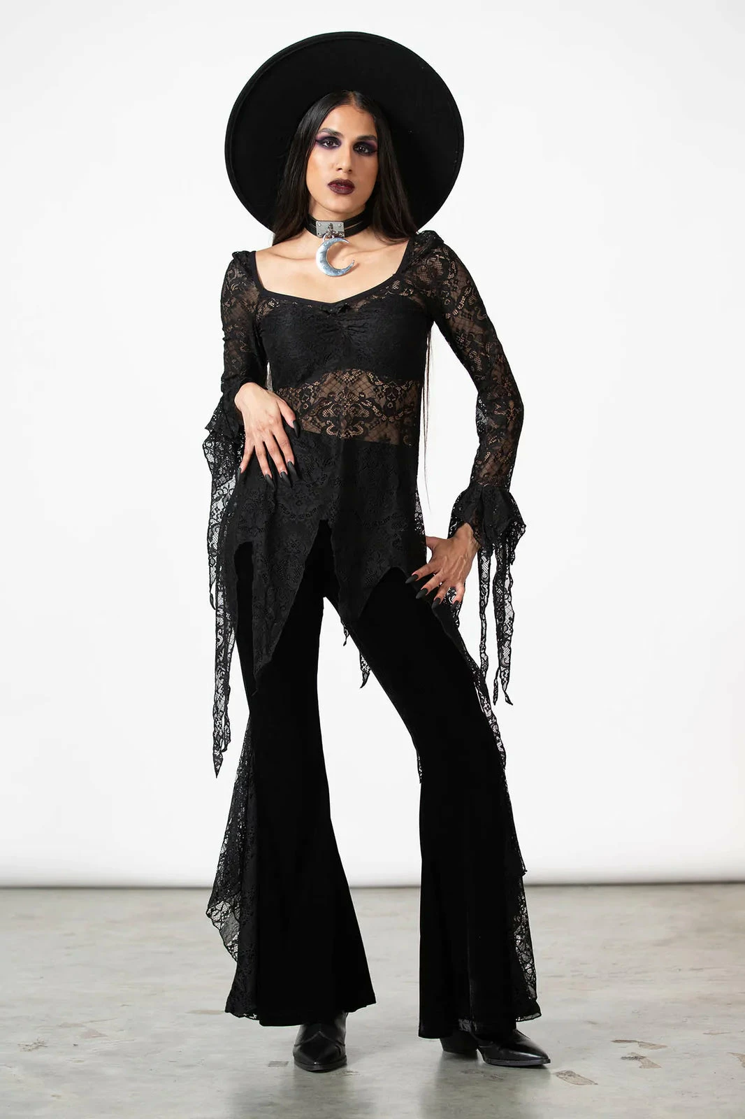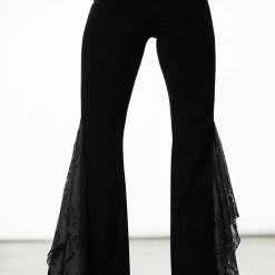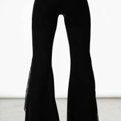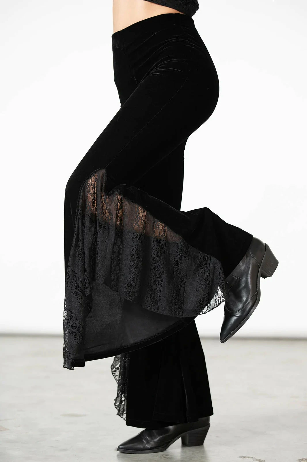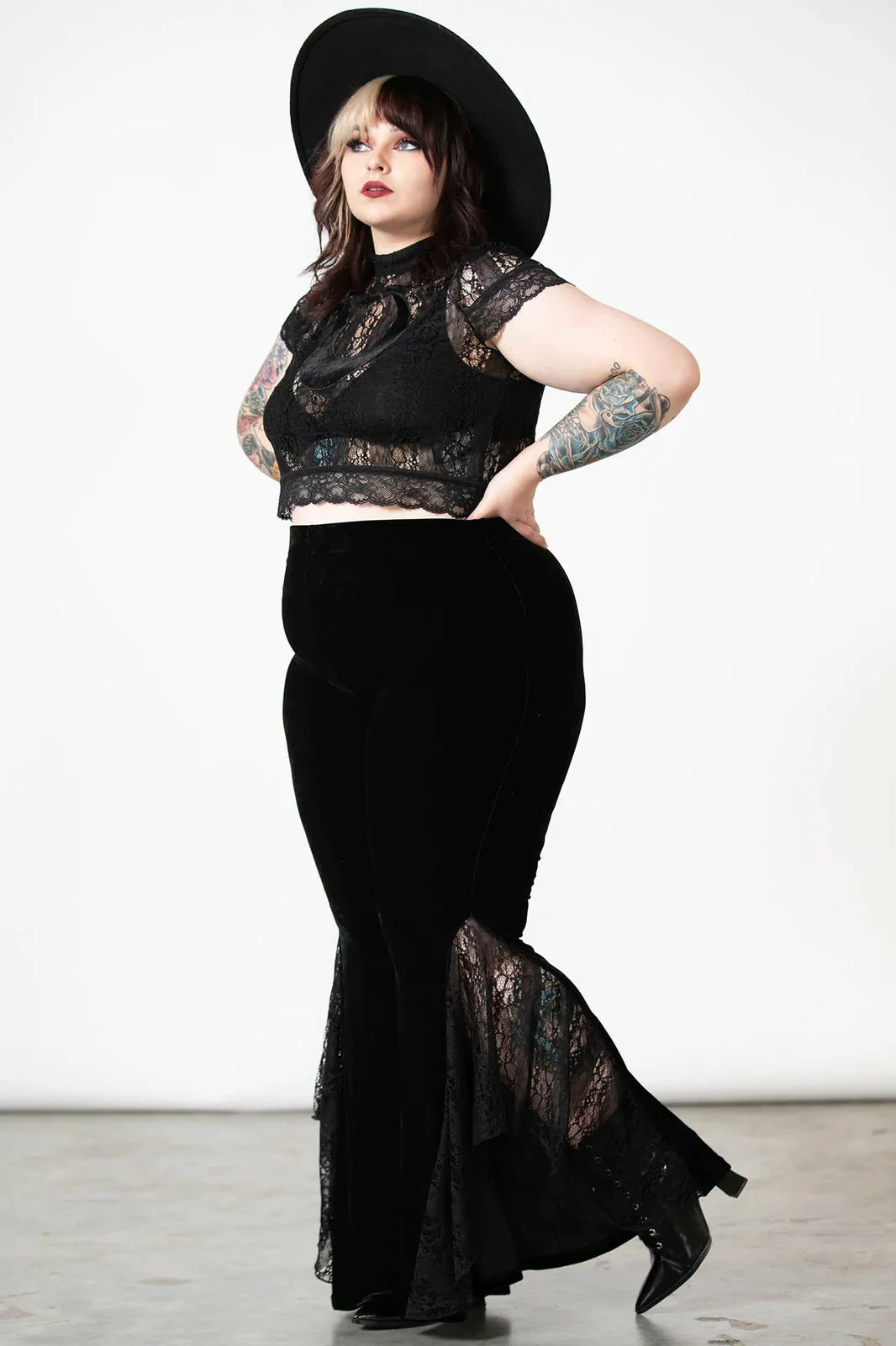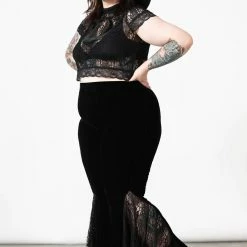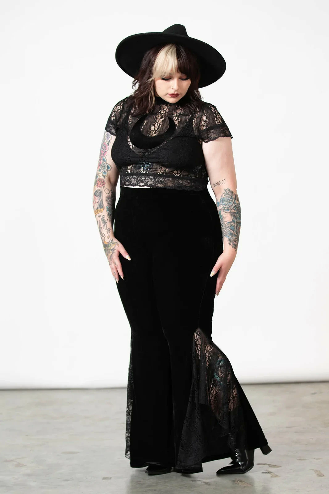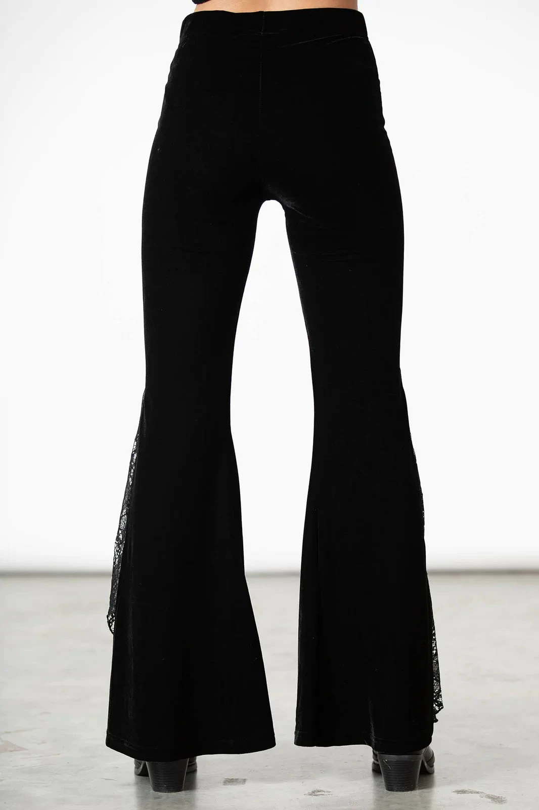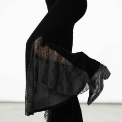 Gorgeous black velvet bell bottoms from Killstar! These must-have long flared high waisted trousers are made from a soft stretchy velvet fabric for a comfortable figure hugging look! These stunning flares will look great with everything and feature a wide elasticated waistband and statement vertical lace insert through the sides of both legs!