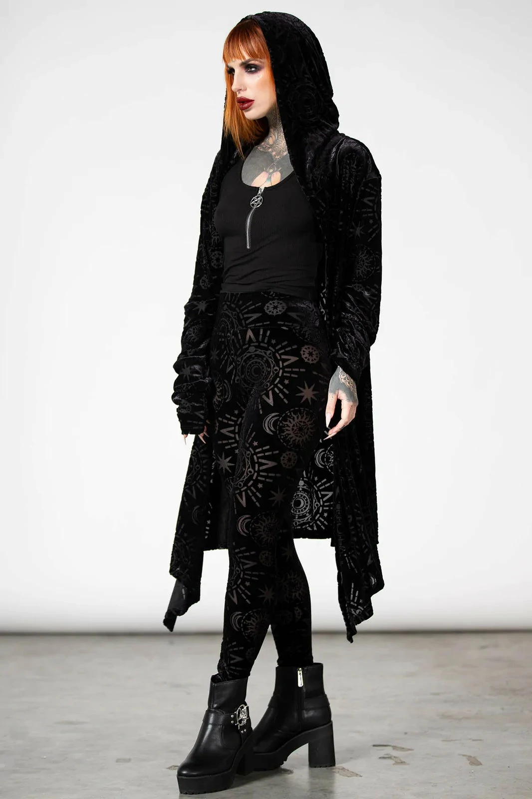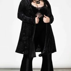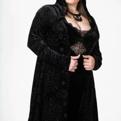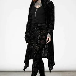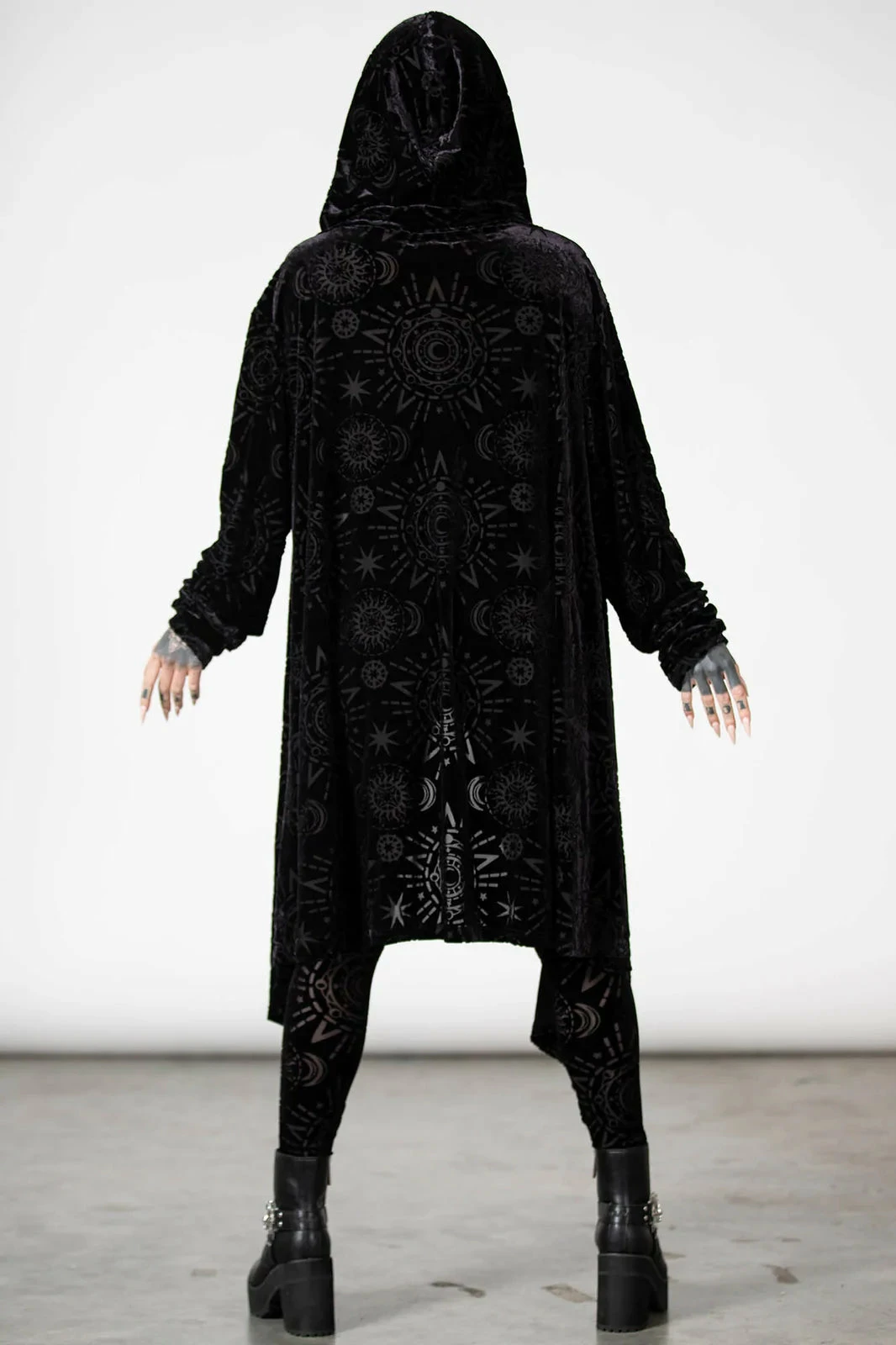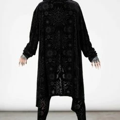 Beautiful long black velvet cardigan from Killstar that is made from a luxuriously soft stretchy embossed velvet fabric with statement pattern that will give you the ultimate comfort and flowing loose elegant style. This must-have long cardigan looks great on everyone and features a hanky hem and oversized hood! Perfect for layering!