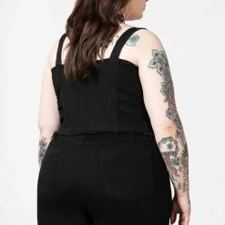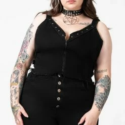 This sexy and striking black zip up cotton top is made from a non stretch distressed denim fabric that is fitted to accentuate your curves. This sultry statement black top features a low neckline and zip front with metal stud detailing and looks great dressed up or down.