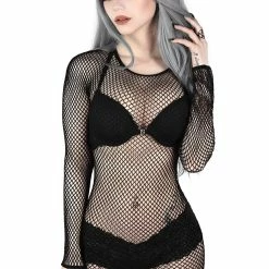 Seductive black fishnet dress from Killstar. This stunning see through long sleeved fishnet bodycon mini dress looks amazing on and is made from a super soft stretchy fabric that will show off those curves!