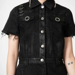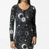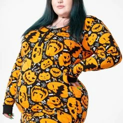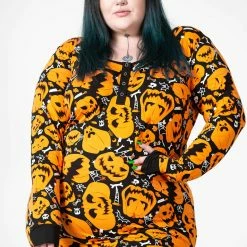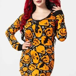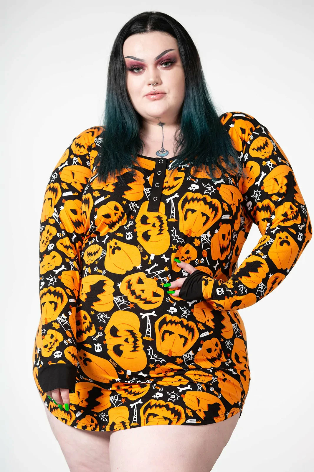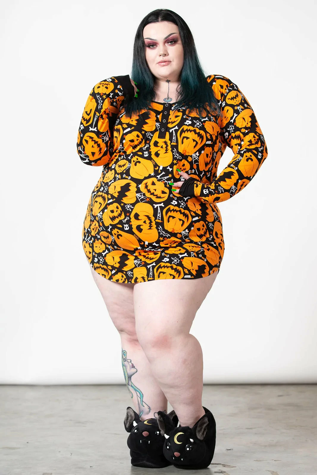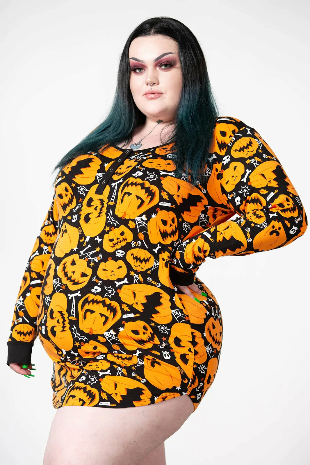 Playful and stylish black sleep dress from Killstar with bold contrast Halloween theme pattern featuring orange pumpkin Jack O’ Lanterns, bones, skulls and spiderwebs!! This must-have night dress is made from a soft stretchy fabric with popper neck closure. It also features long sleeves with cuffs, fitted with scooped hems for a comfortable yet flattering silhouette! The perfect thing for lounging or sleeping in style!