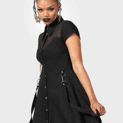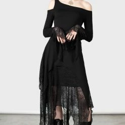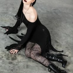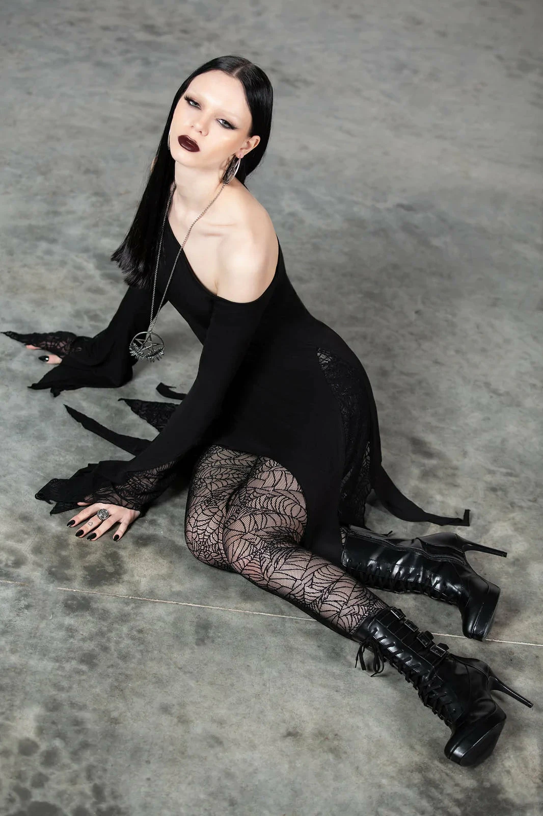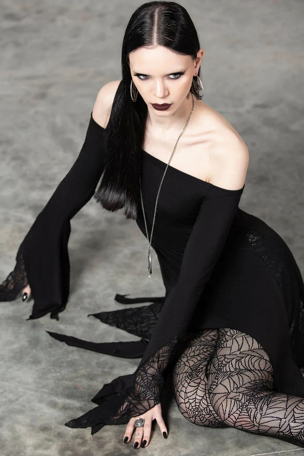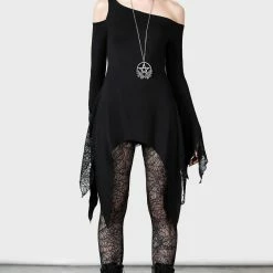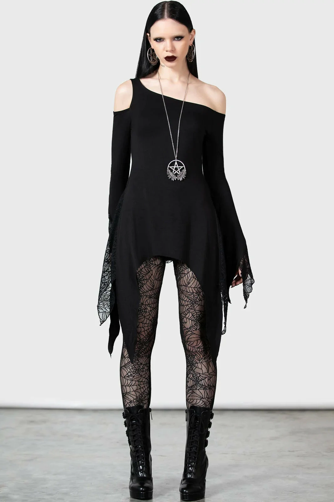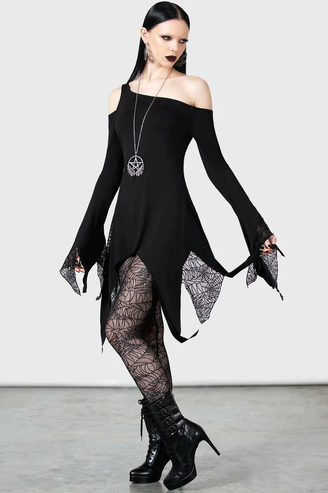 This gorgeous black long sleeved tunic top from Killstar is made from a soft stretch fabric that hugs your curves and drapes to perfection. Totally versatile, this stunning dropped cold shoulder top has dramatic spiderweb lace inserts, long flared sleeves and hanky hems. This beautiful black long fitted top is sure to turn heads, can be worn as a dress if you feel daring!