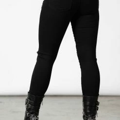 Figure hugging black skinny jeans from Killstar that are made from stretch denim with a flattering fitted design. These stand out jeans feature a 5 pocket style with mesh inserts, zip and stud details and belt loops. Dress them up or down, these No Feelings jeans set you apart from the crowd!