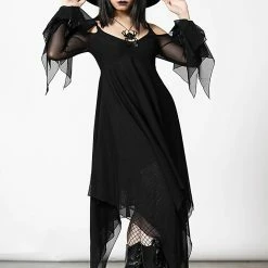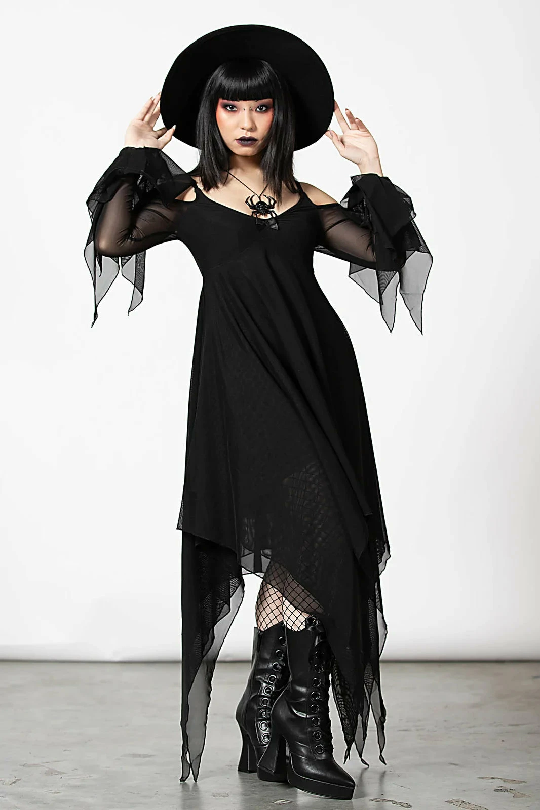 The gorgeous Omen Crush Dress from Killstar features a cold shoulder design with adjustable spaghetti straps and cute bow adornment. With long mesh sleeves, layered flared cuffs and a layered witchy hemline, this beautiful floaty dress is fully lined and looks fabulous on.