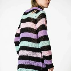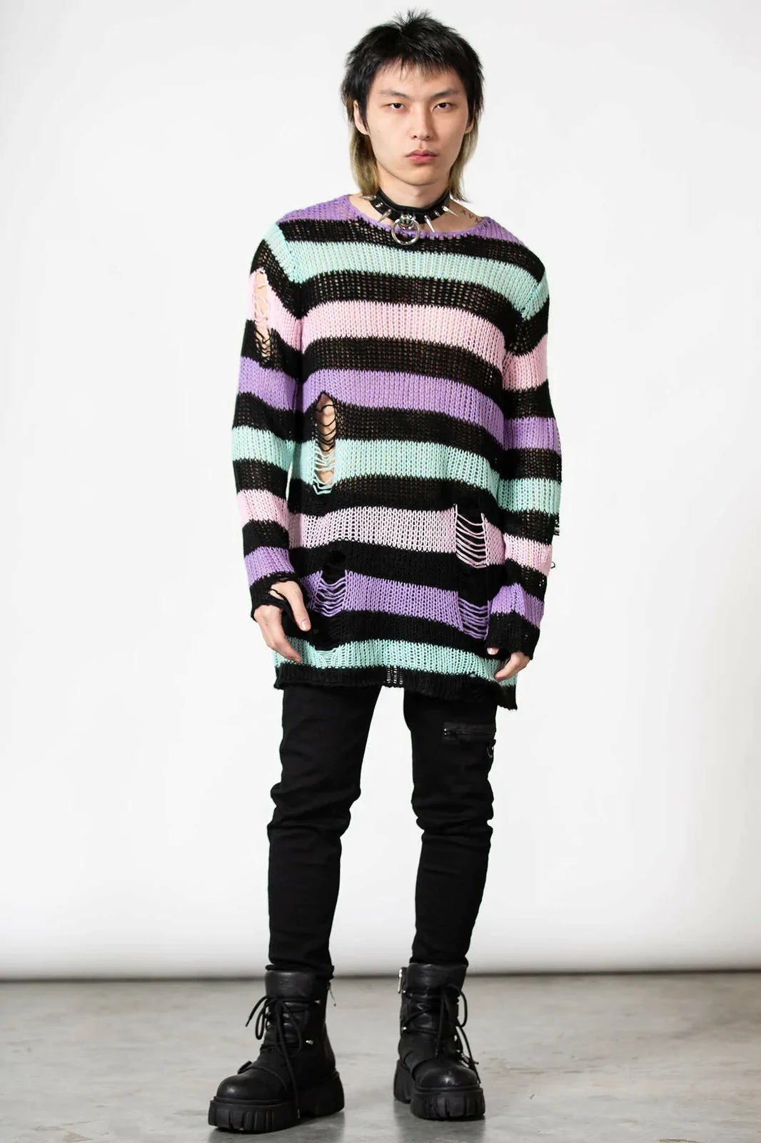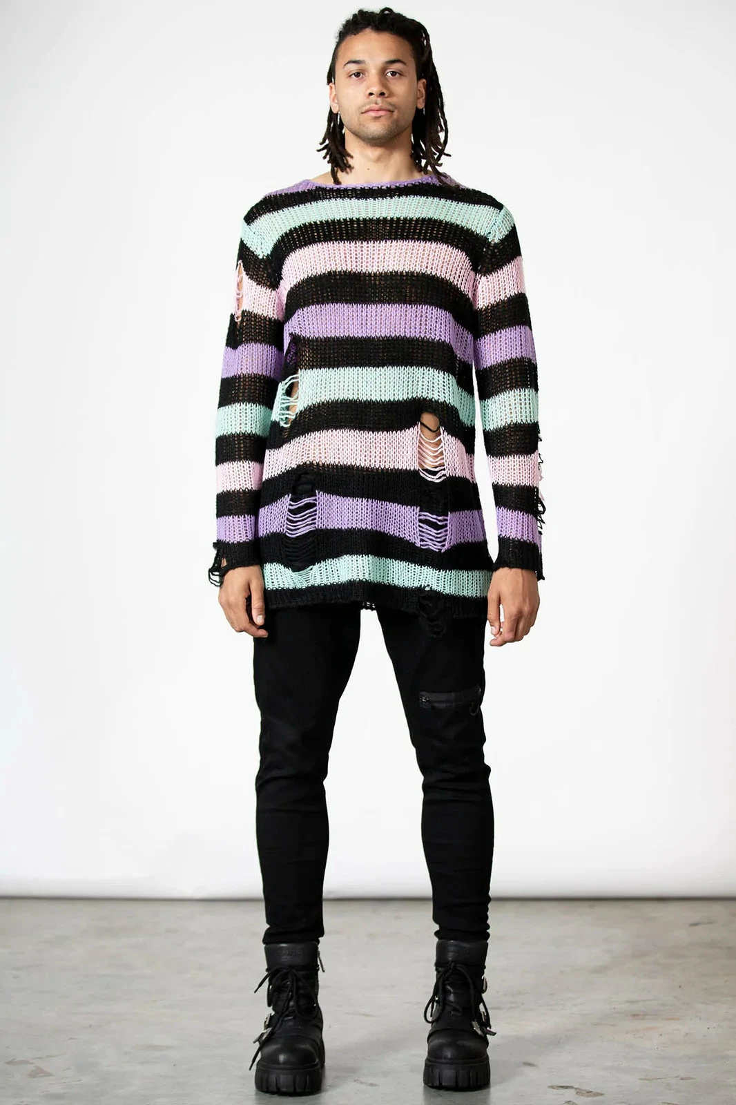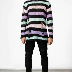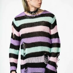 This awesome pullover is a black and multicolor pastel contrast stripe sweater made from soft knitted fabric that looks great on everyone! This unisex soft knitted jumper features distress detailing, relaxed fit and extra long length. This statement piece looks stunning dressed up or down!