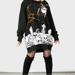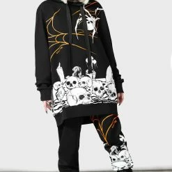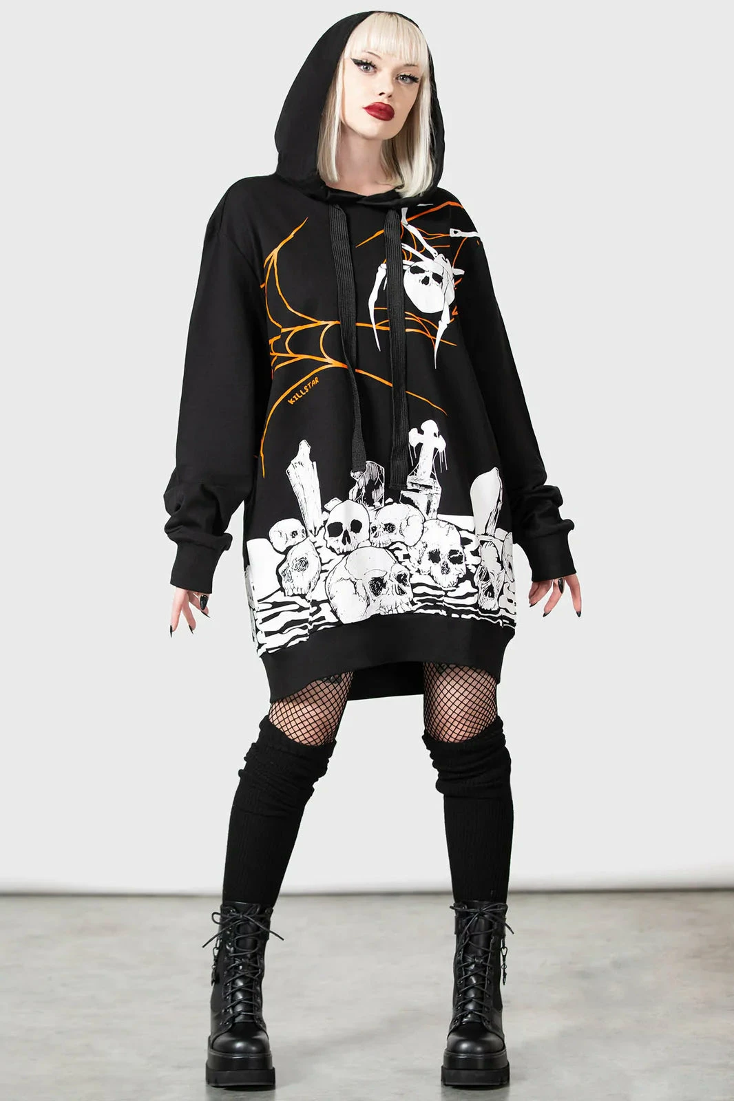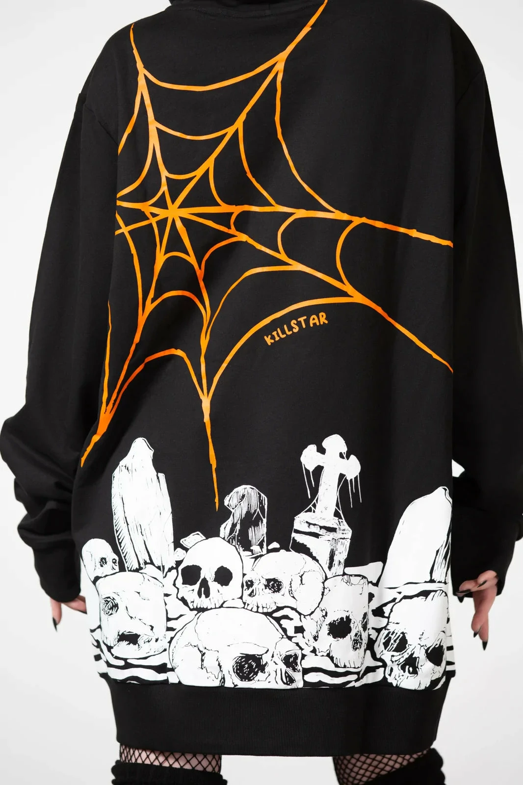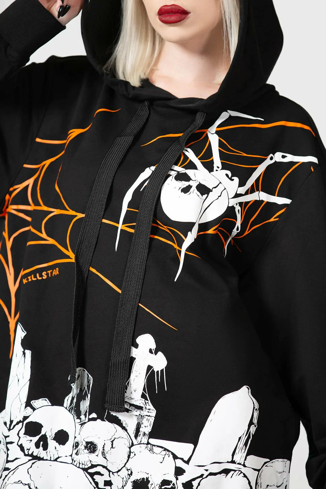 Spooky black hoodie from Killstar that is made with Halloween / scary theme orange spiderwebs and white statement skull, spider and graveyard design. Features an XL hood with drawstring and long sleeves, made from a soft comfy cotton fabric. Get with the afterlife party!
