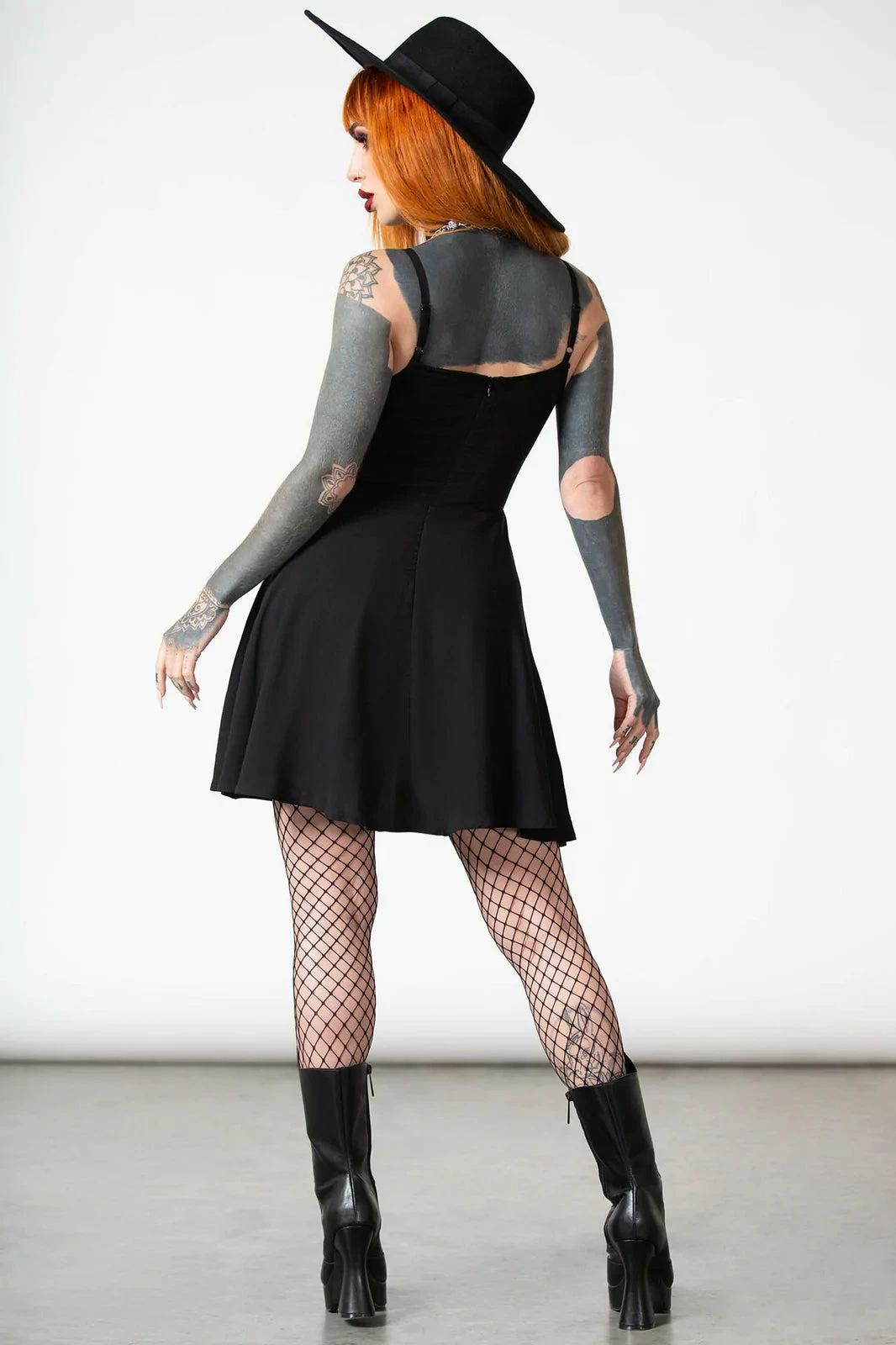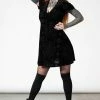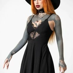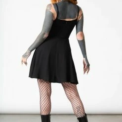 Stunning delicate A-line black mini dress from Killstar made from a soft non stretch fabric with a sensual low V neck and front cut out with lace trims! This lovely sleeveless mini dress features adjustable thin straps and a hidden back zip. It flares out from the waist for a flattering fit and is available in a wide range of sizes.