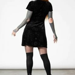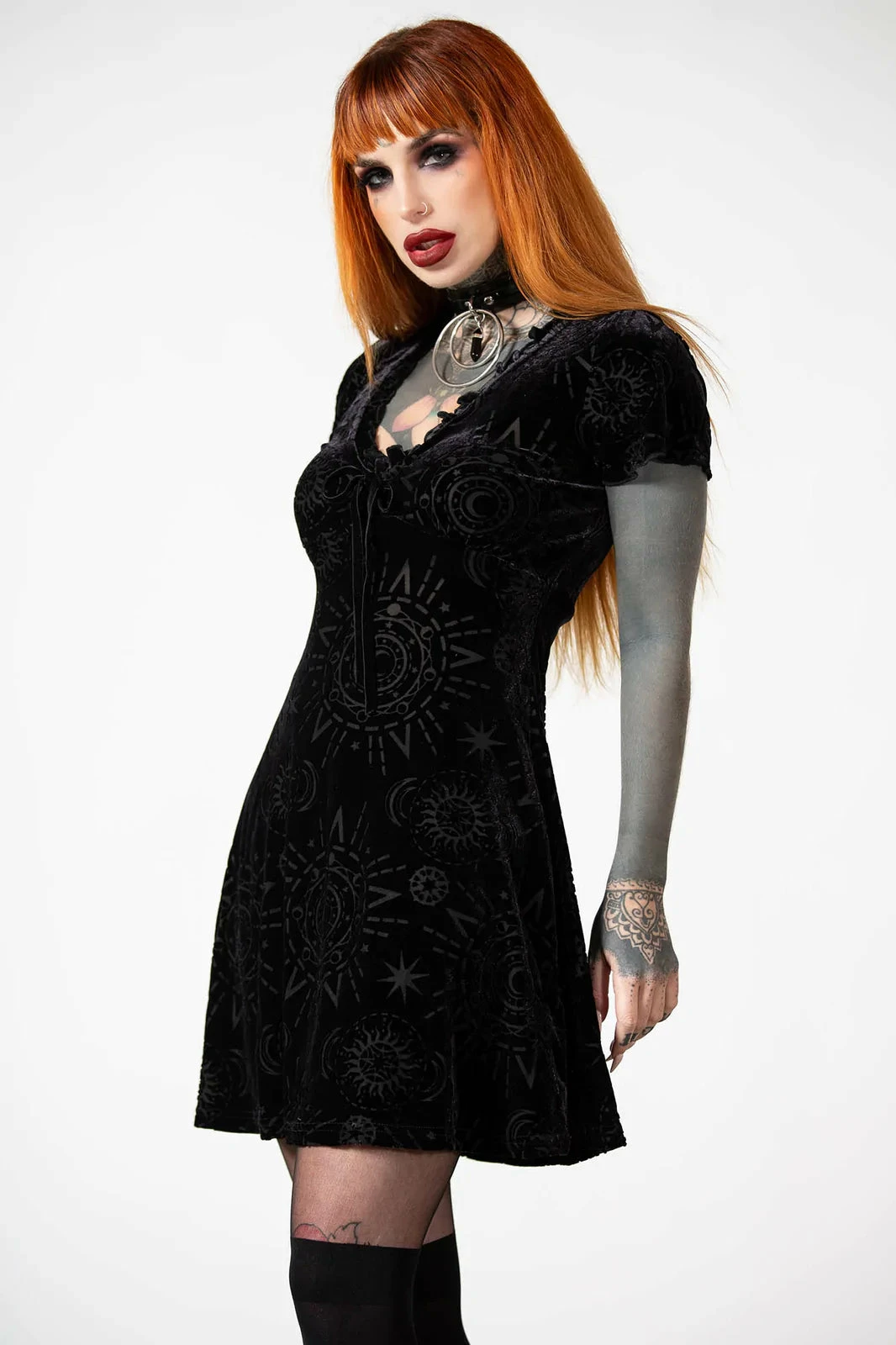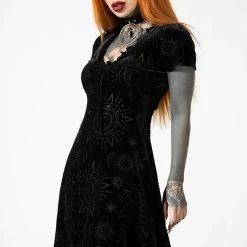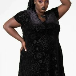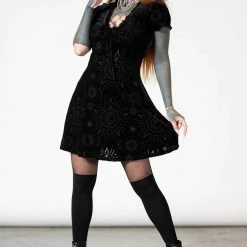 Lovely black velvet mini dress from Killstar. This stunning dress is made from a luxury soft stretchy velvet fabric that is fitted to accentuate your figure and has a statement burnout pattern. This beautiful black dress features a V neck with ribbon and frill detailing and short cap sleeves. Elegant and glamorous, this dress has an A-line silhouette with a nipped in waist and flowing skater style skirt.