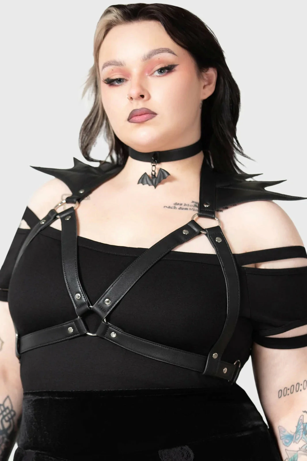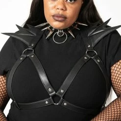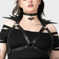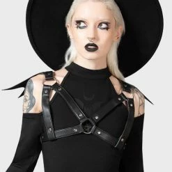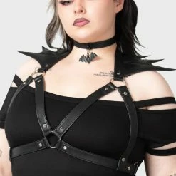 This awesome body harness will add drama to any outfit! This statement harness has adjustable straps with buckles for the perfect fit and is made from vegan leather with metal hardware and XL O-ring details. Also features a statement bat style winged collar which is 14.5cm/5.7″ high and 11.5cm/4.5″ wide.