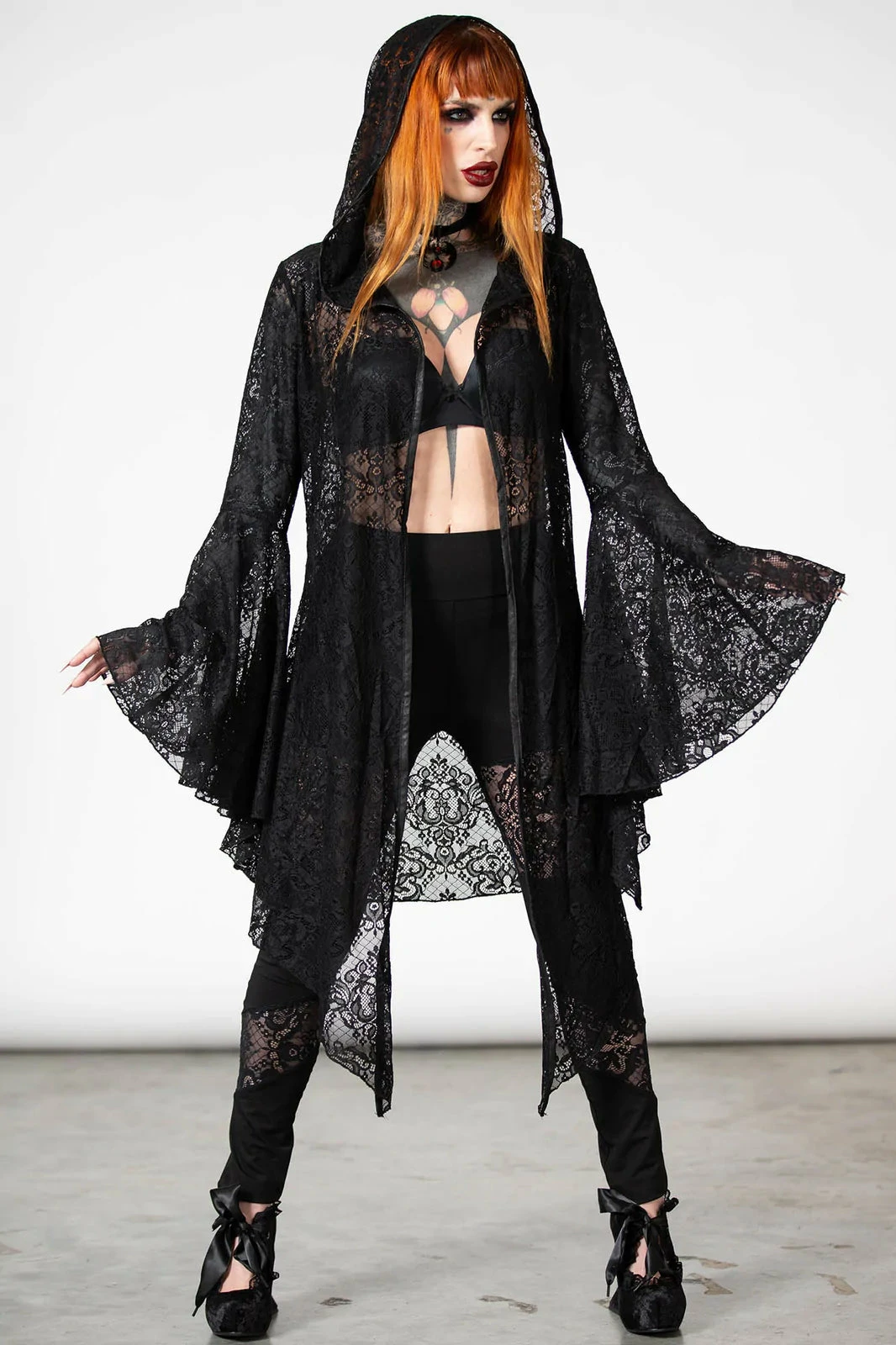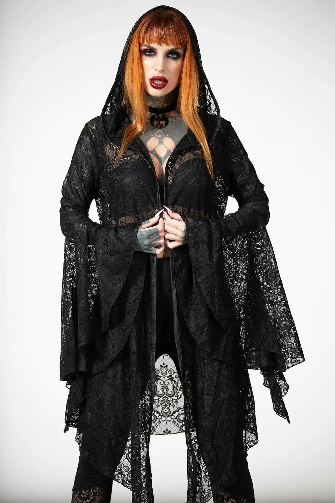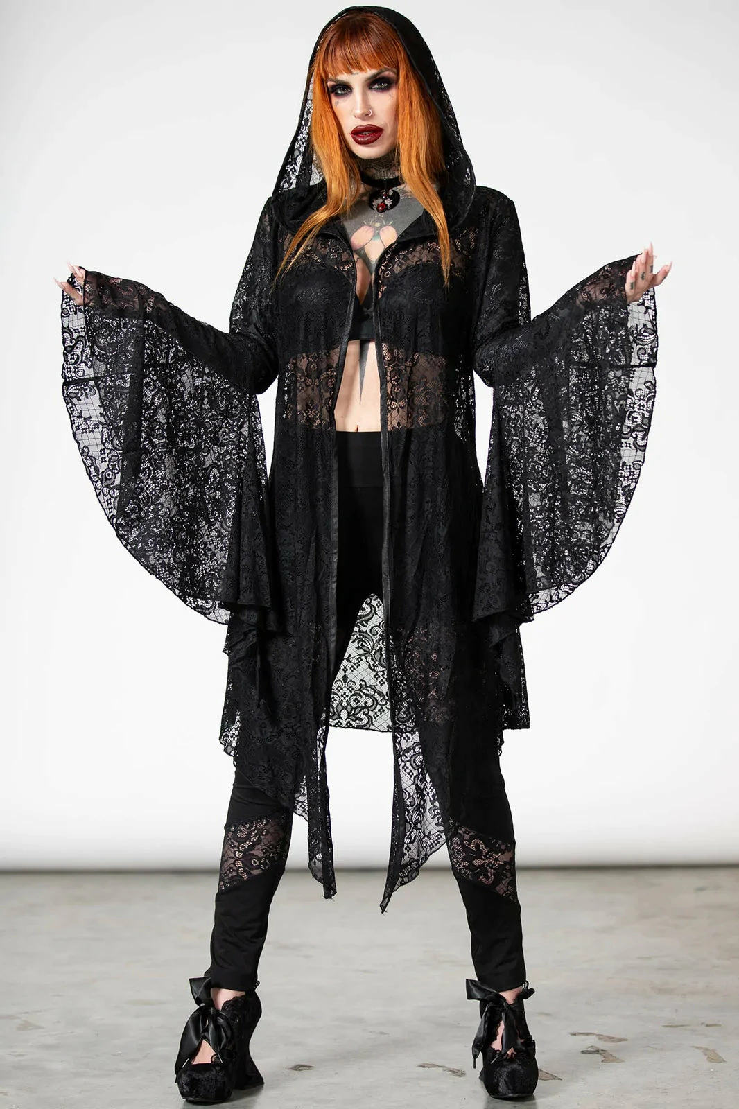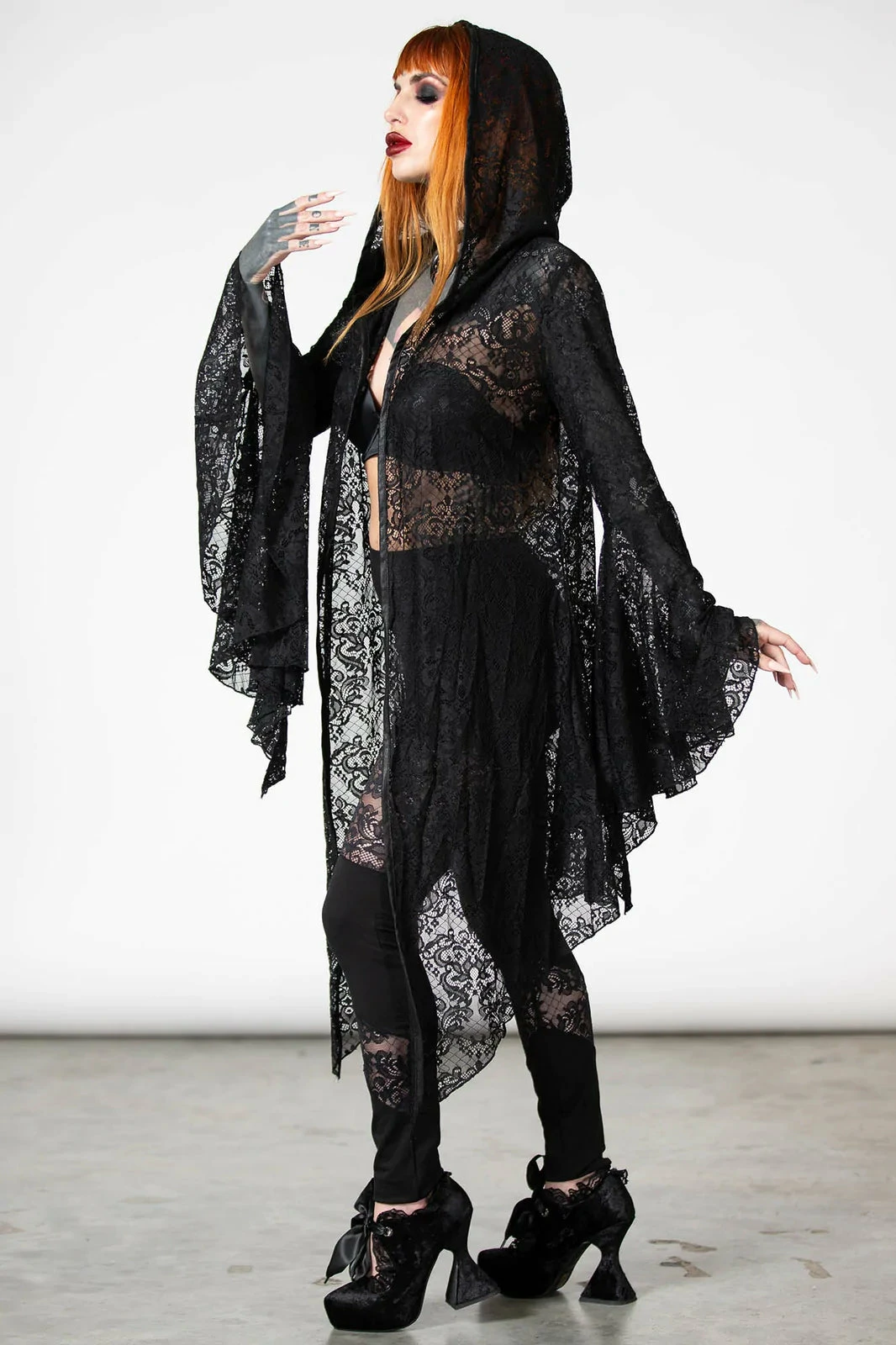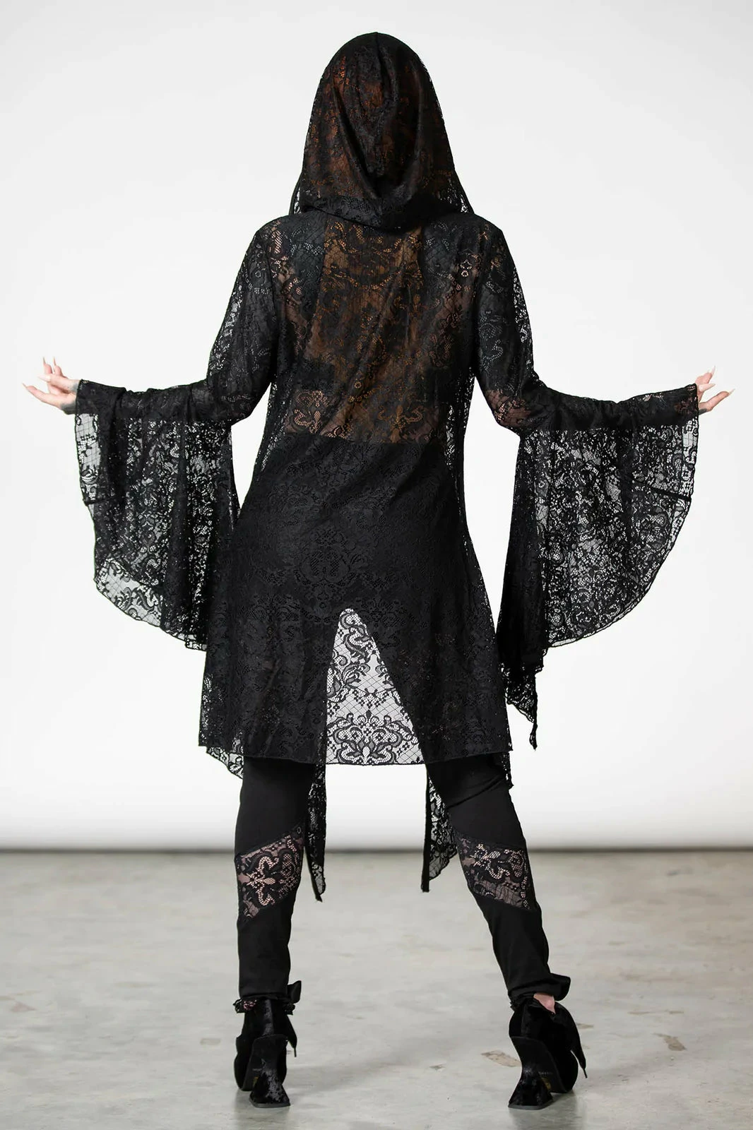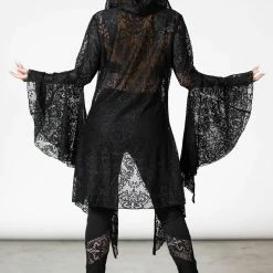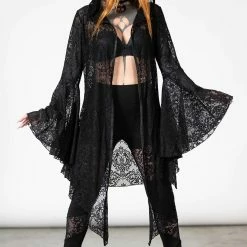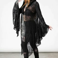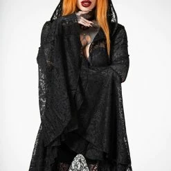 Dramatic and beautiful long black hooded lace cape from Killstar! This gorgeous relaxed fit cloak is made from a luxury soft stretchy lace fabric with XL hood, hanky hem and flowing long bell sleeves! This enchanting see through lace cape is worthy of any dark sorceress!