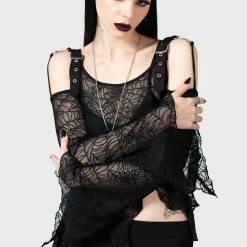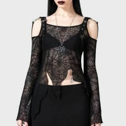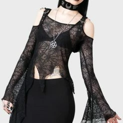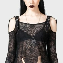 Stylish black long sleeved mesh top from Killstar made from a stretchy soft spiderweb lace fabric with cold shoulders with long flared sleeves and hanky hems. This stunning body hugging black fishnet top will show off your curves to perfection with some extra attitude and also features adjustable statement straps and metal hardware detailing.